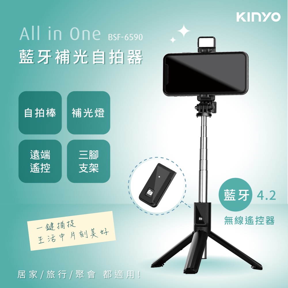 〖KINYO〗 藍牙補光自拍器 (BSF) 6段延長桿 遙控器 補光燈|旅遊 自拍 國旅 一年保固BSF6590 自拍器Selfie AccessoriesKINYO官方旗艦店_家電館