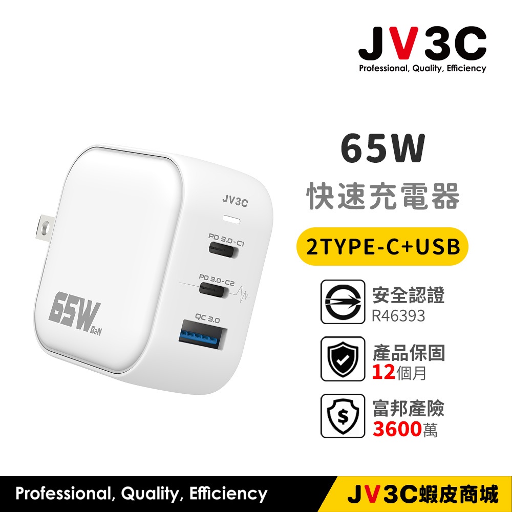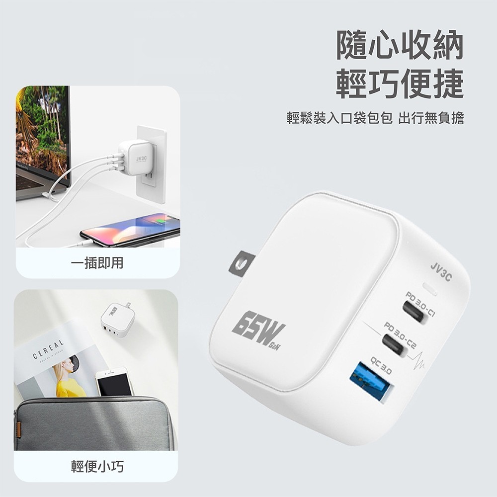 JV3C 65W GaN氮化鎵 三孔快速充電器 PD QC 閃電充電器 充電頭 充電器 BSMI認證 快充頭 快充 插頭白色Cables, Chargers & ConvertersJV3C商城