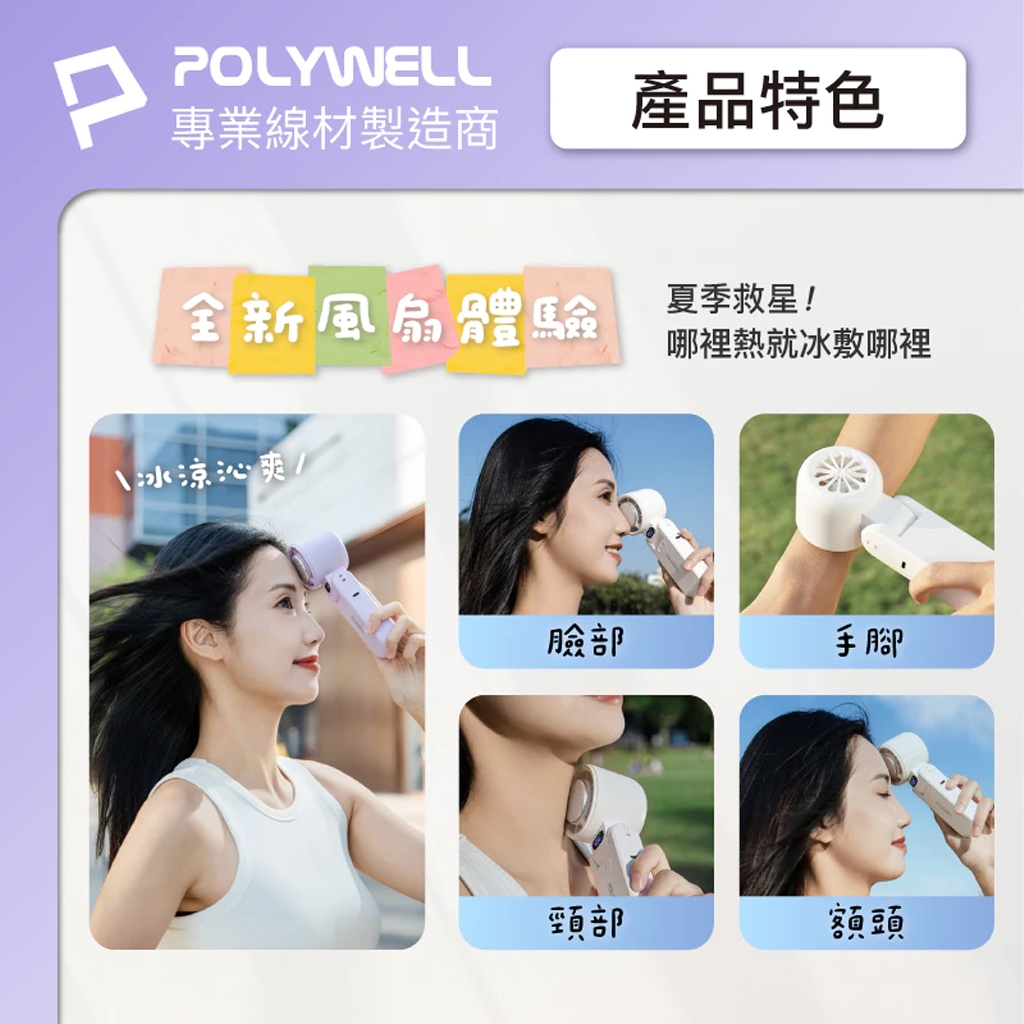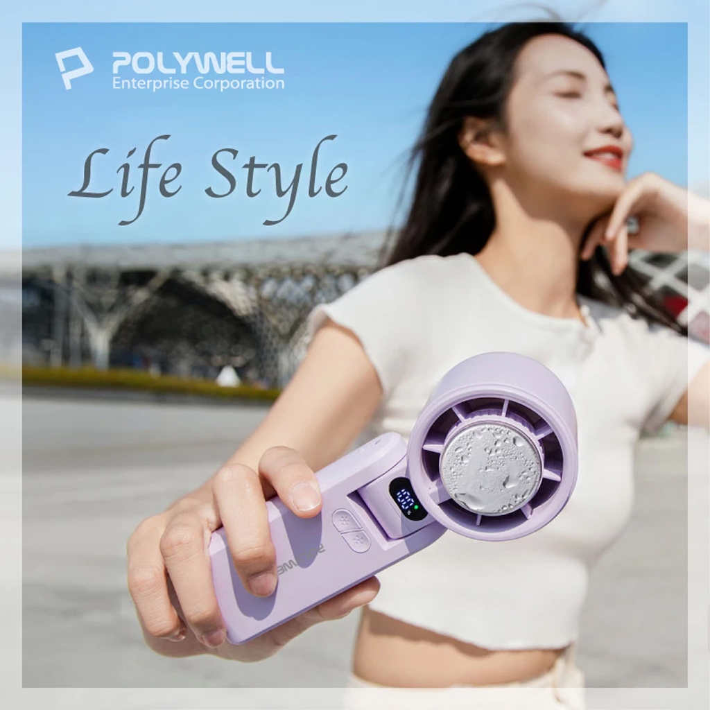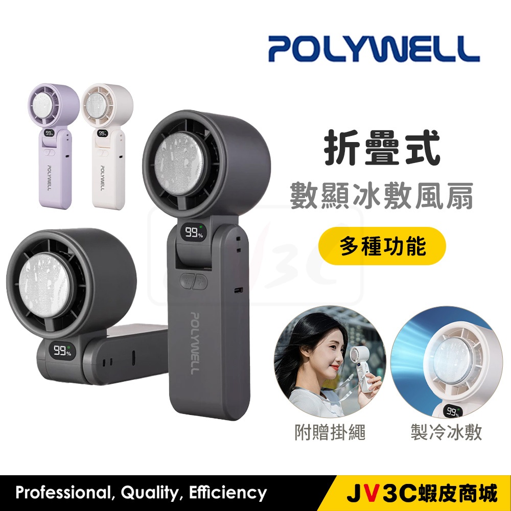 POLYWELL 折疊式 數顯冰敷風扇 風扇 手持風扇 掛脖風扇 摺疊風扇 冷敷降溫 Type-C充電 附掛繩鐵灰色|白色|紫色OthersJV3C商城