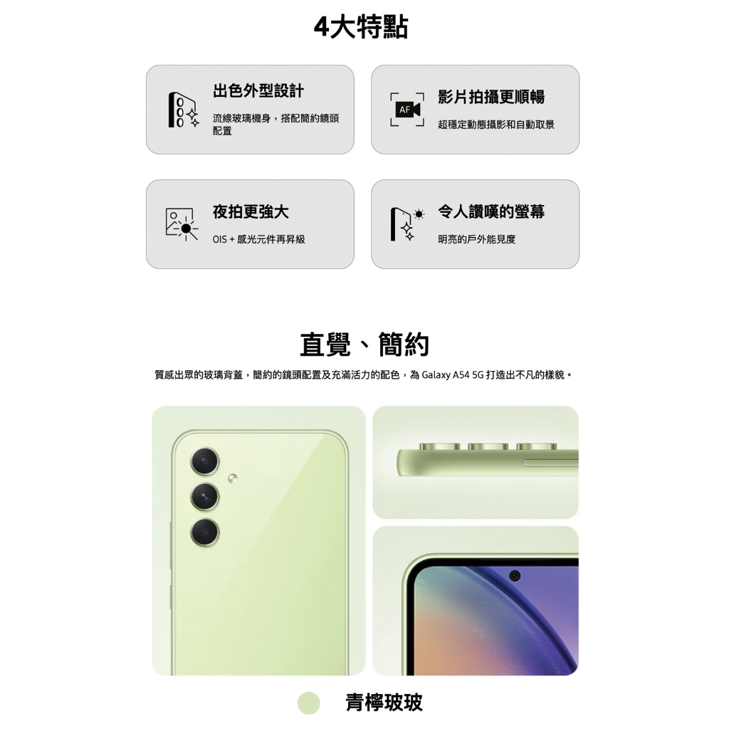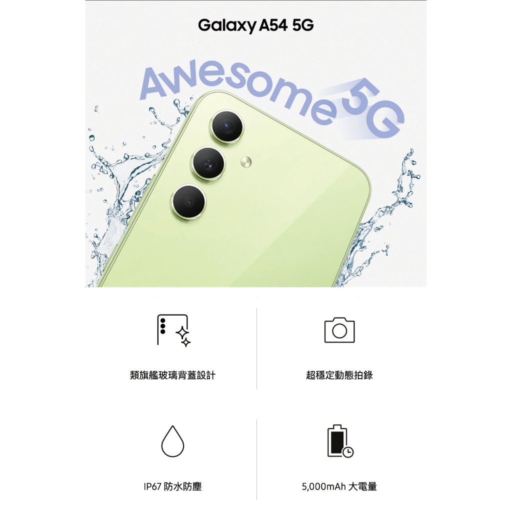 Samsung Galaxy A54 128G | 256G 5G Android 優選二手機 保固6個月 K3數位白玉玻玻,6G /128G|紫芋玻玻,6G /128G|紫芋玻玻,8G / 256G|白玉玻玻,8G / 256G|青檸玻玻,6G /128G|青檸玻玻,8G / 256G|黑糖玻玻,6G /128G|黑糖玻玻,8G / 256GK3數位福利機商城 | 手機醫生認證