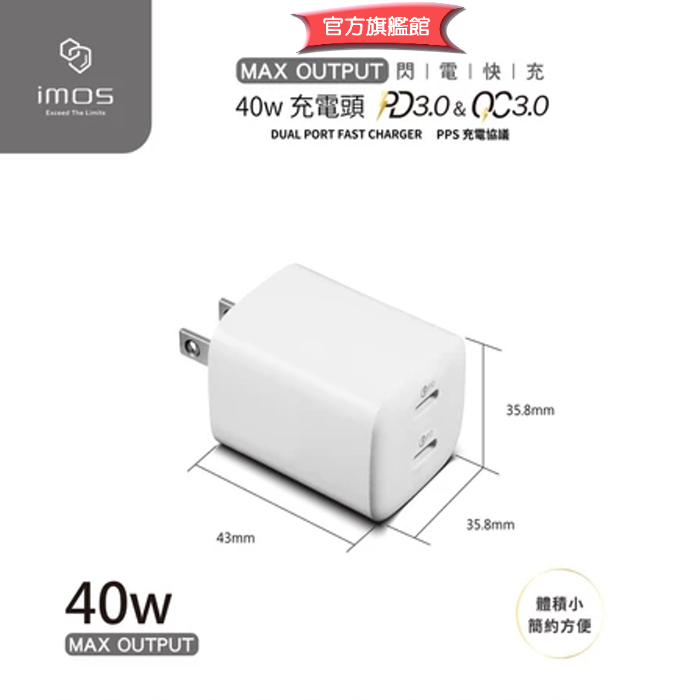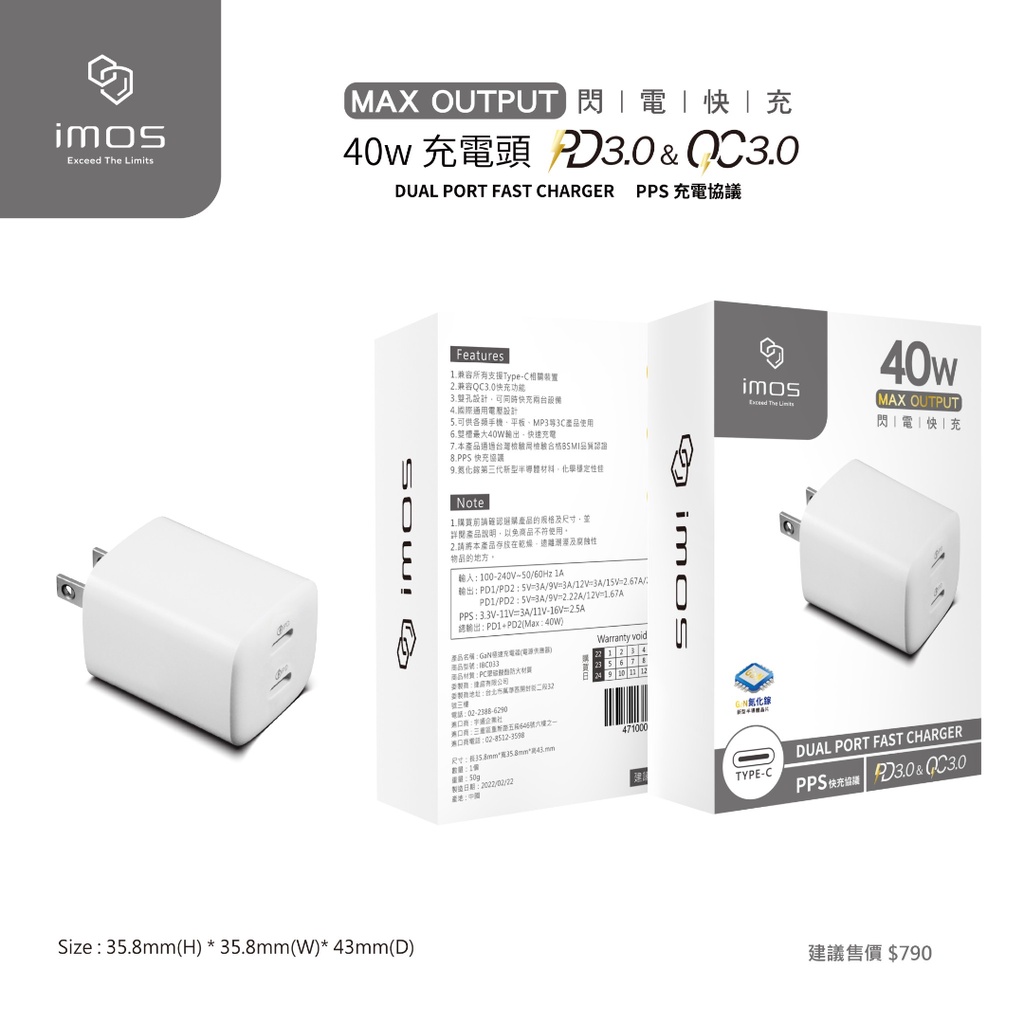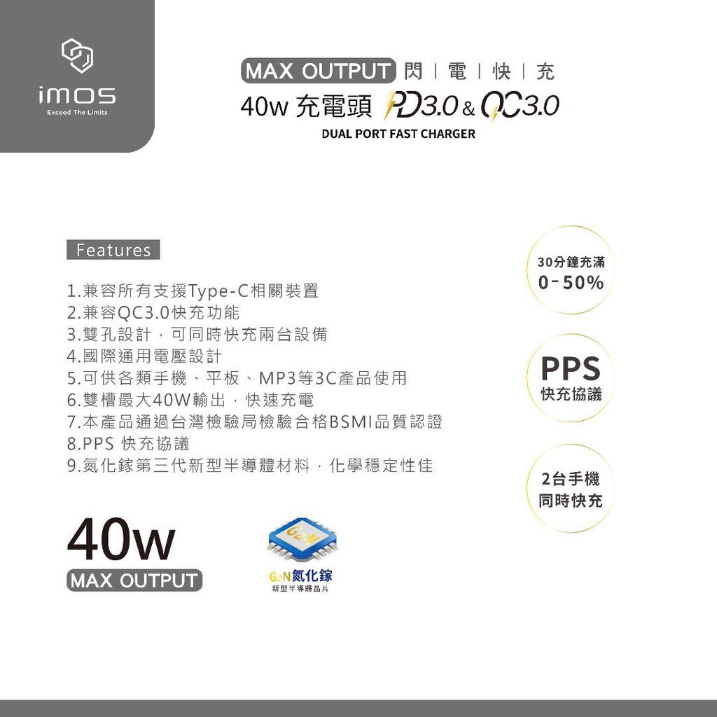imos【官方旗艦館】保固3年 QC3.0+ PD 3.0 雙孔 40W 氮化鎵 GaN 快充充電器旅充快速充電頭imos【官方旗艦館】保固3年 QC3.0+ PD 3.0 雙孔 40W 氮化鎵 GaN 快充充電器旅充快速充電頭Cables, Chargers & Convertersimos 官方旗艦館