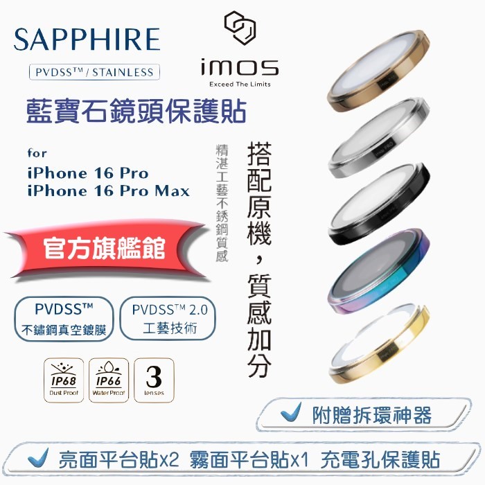 imos (官方旗艦館) iPhone 16 Pro 16 Pro Max 鏡頭貼 藍寶石鏡頭保護貼 贈4樣專屬小工具