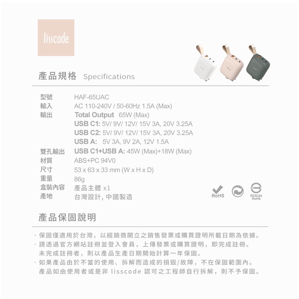 Lisscode 小饅頭 氮化鎵極速充電器 1A+2C 65W 白色Lisscode 小饅頭 氮化鎵極速充電器 1A+2C 65W 白色Cables, Chargers & ConvertersLisscode 官方
