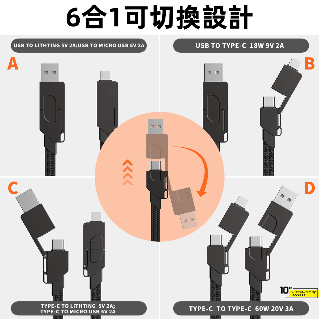 鋅合金 六合一 瑞士軍刀線 充電線 手機線 傳輸線 雙TypeC 蘋果線 數據線 快充 鑰匙扣 PD 安卓 0.15M深灰色|灰白色|橙灰色Cables, Chargers & Convertersibits手機配件 官方旗艦館