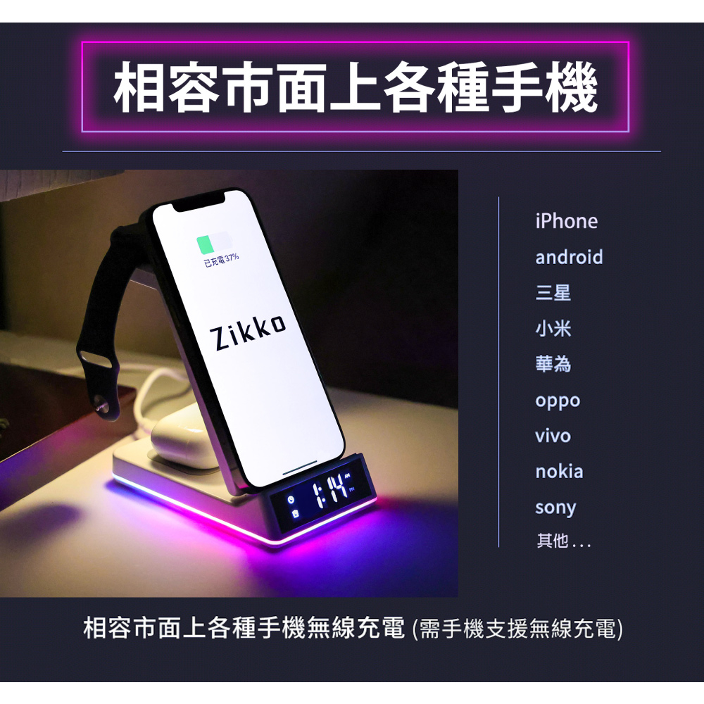 Zikko 7合1 無線快充座 (Qi三充+多孔充+時鐘+LED燈)