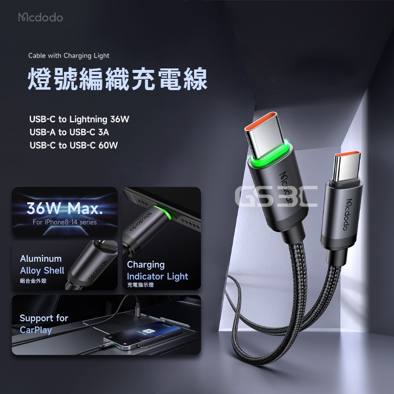 Mcdodo 麥多多 燈號 充電線 USB-C / A to C/Lightning 傳輸線 PD 快充 閃充 編織線材USB A to C(3A),1m|C to C(60W),1m|C to L(36W),1mCables, Chargers & ConvertersGS 3C 手機平板配件選品店