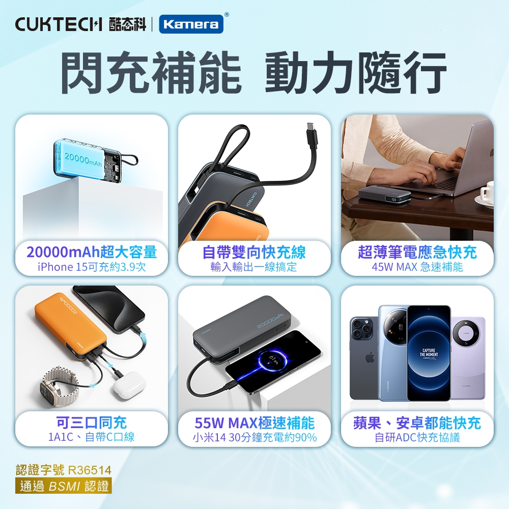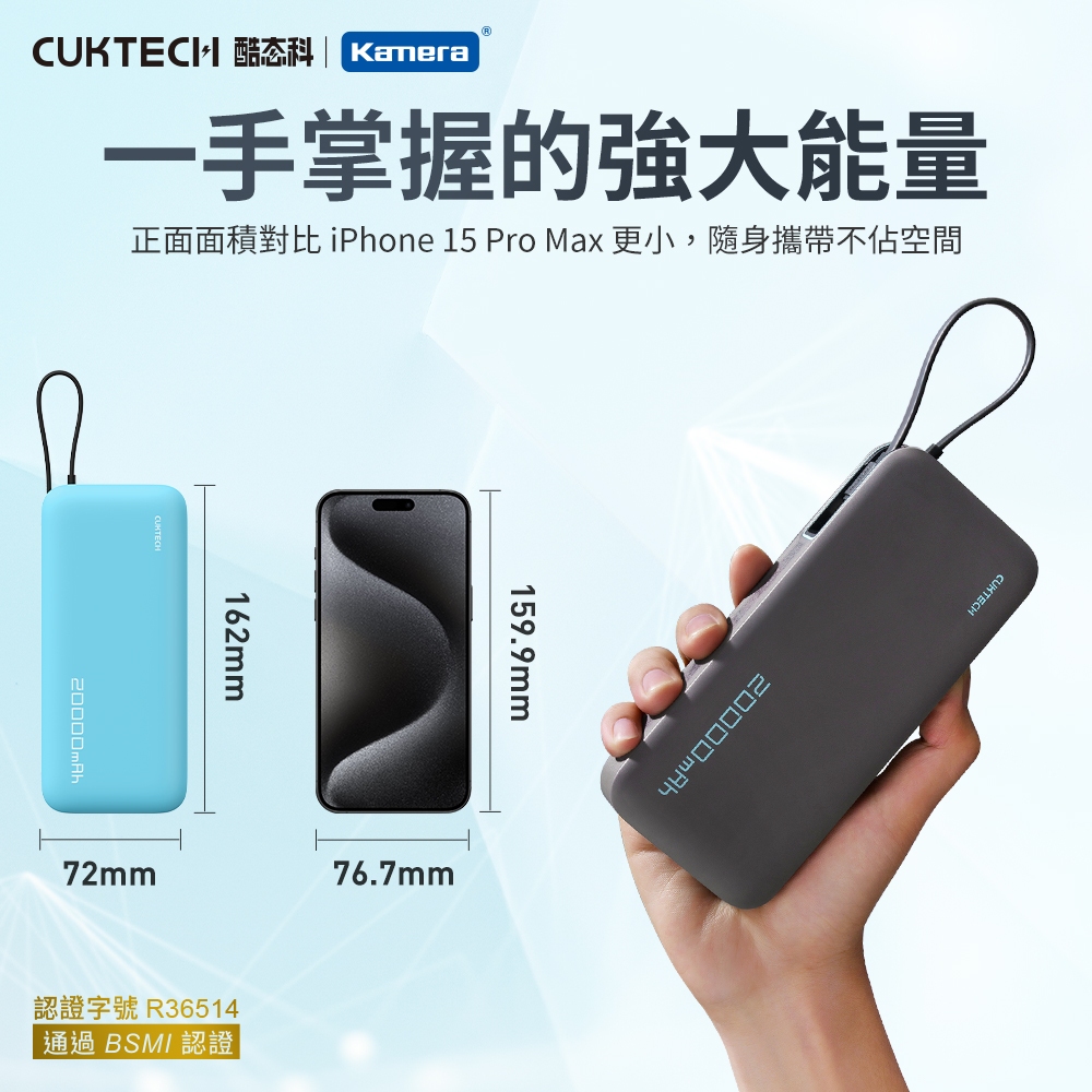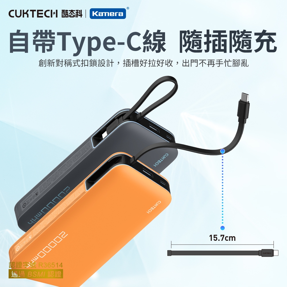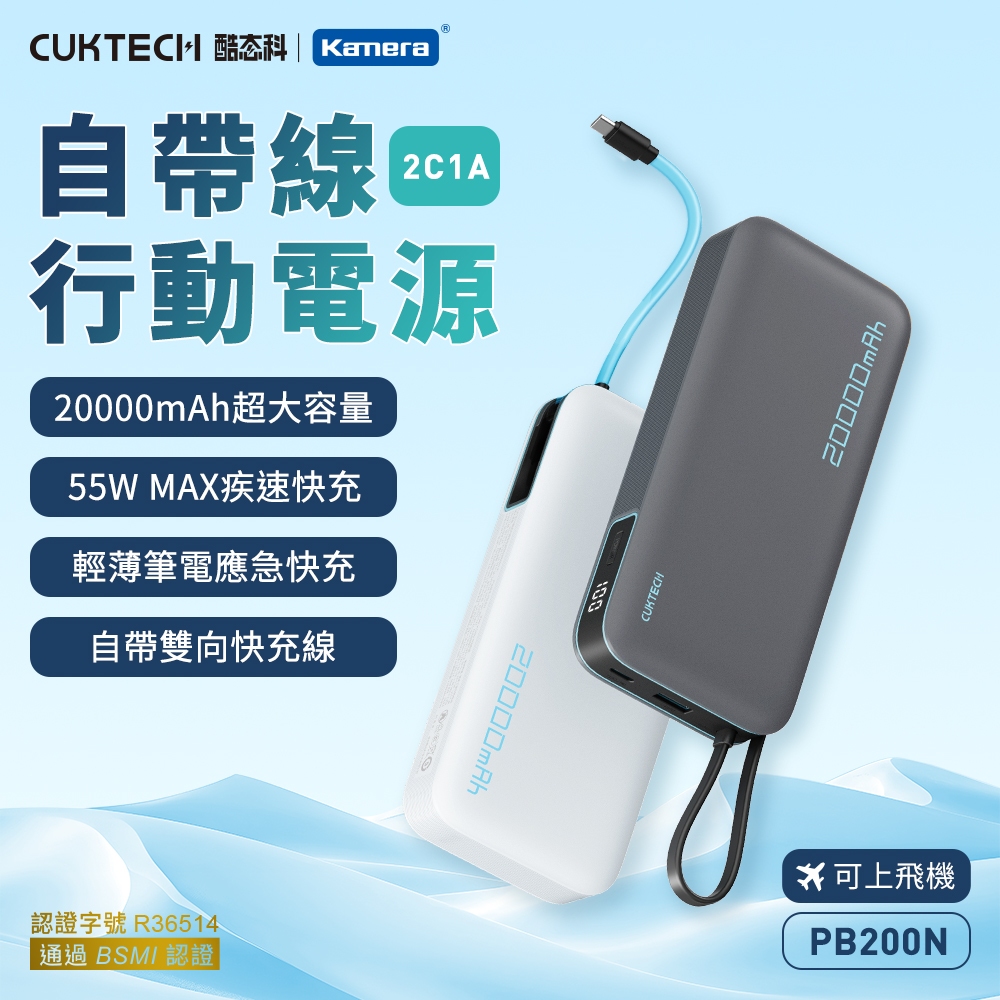 CUKTECH 酷態科 55W TYPE-C 自帶線行動電源 20000mAh (PB200N) 符合航空規範 可上飛機灰色|銀白Powerbanks & BatteriesKamera 佳美能旗艦館
