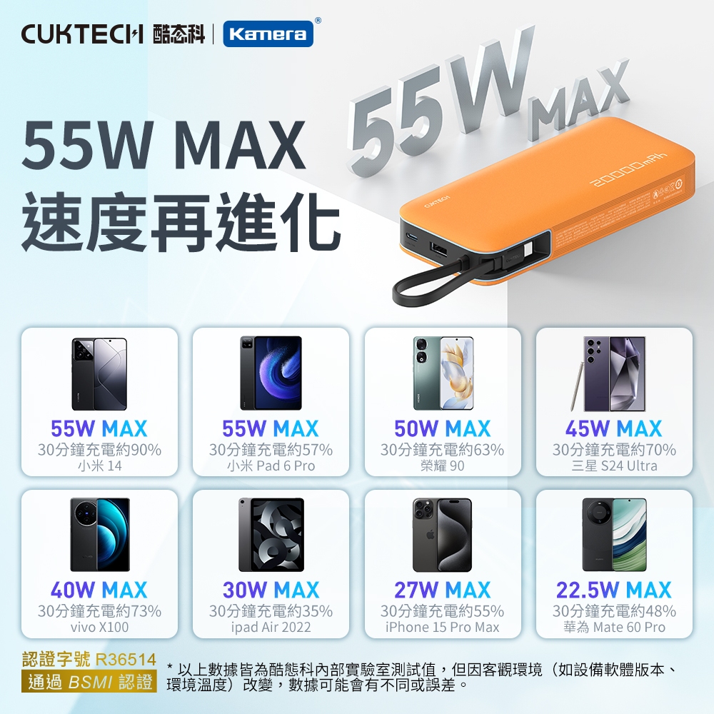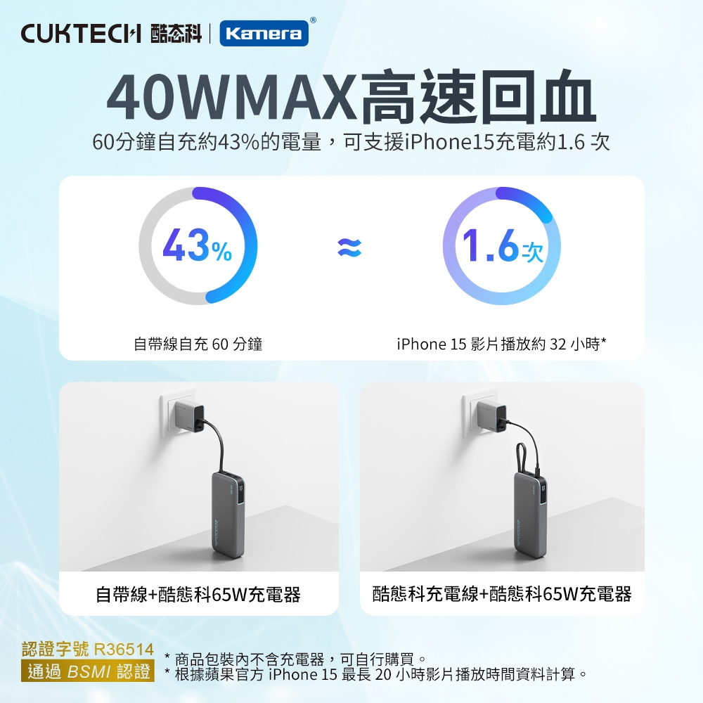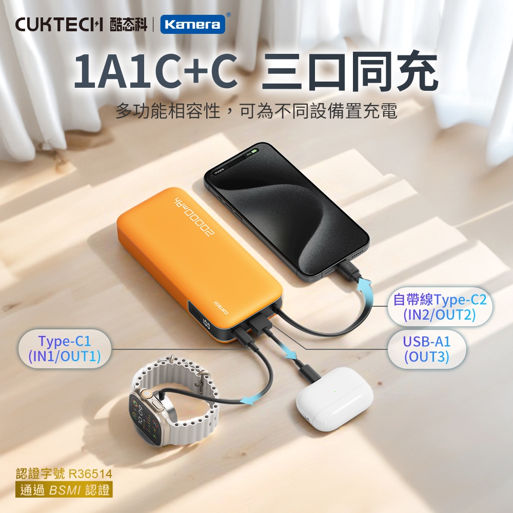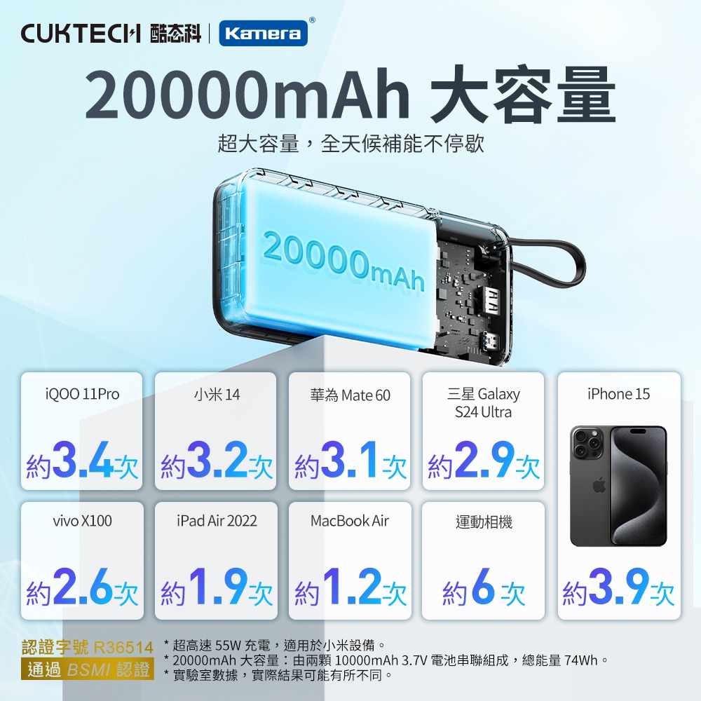 CUKTECH 酷態科 55W TYPE-C 自帶線行動電源 20000mAh (PB200N) 符合航空規範 可上飛機灰色|銀白Powerbanks & BatteriesKamera 佳美能旗艦館