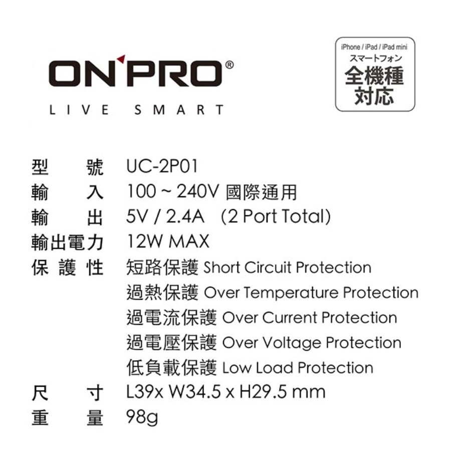 【ONPRO】 UC-2P01 2.4A 雙孔 USB充電器 急速充電 快速充電 國際電壓_Kimi極美職人推薦