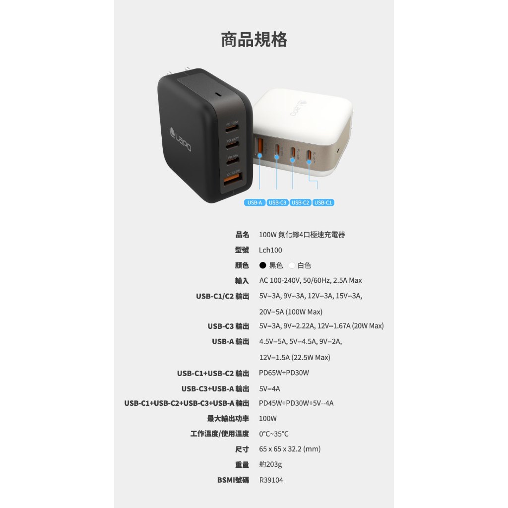 【LaPO】100W 氮化鎵4口極速充電器 GAN 氮化鎵 充電頭 豆腐頭 快充 Lch100白色|黑色Cables, Chargers & ConvertersLaPO 品牌旗艦店