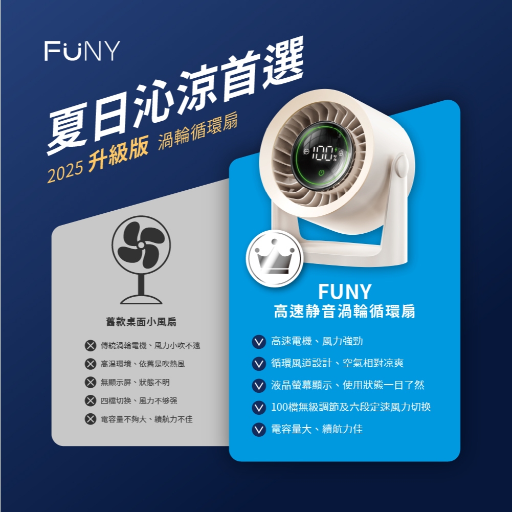 • 官方直營【FUNY】高速靜音渦輪循環扇 2025新款 風扇 桌立 吊掛 可攜式 USB充電 調角度 長效電力 贈壁掛貼