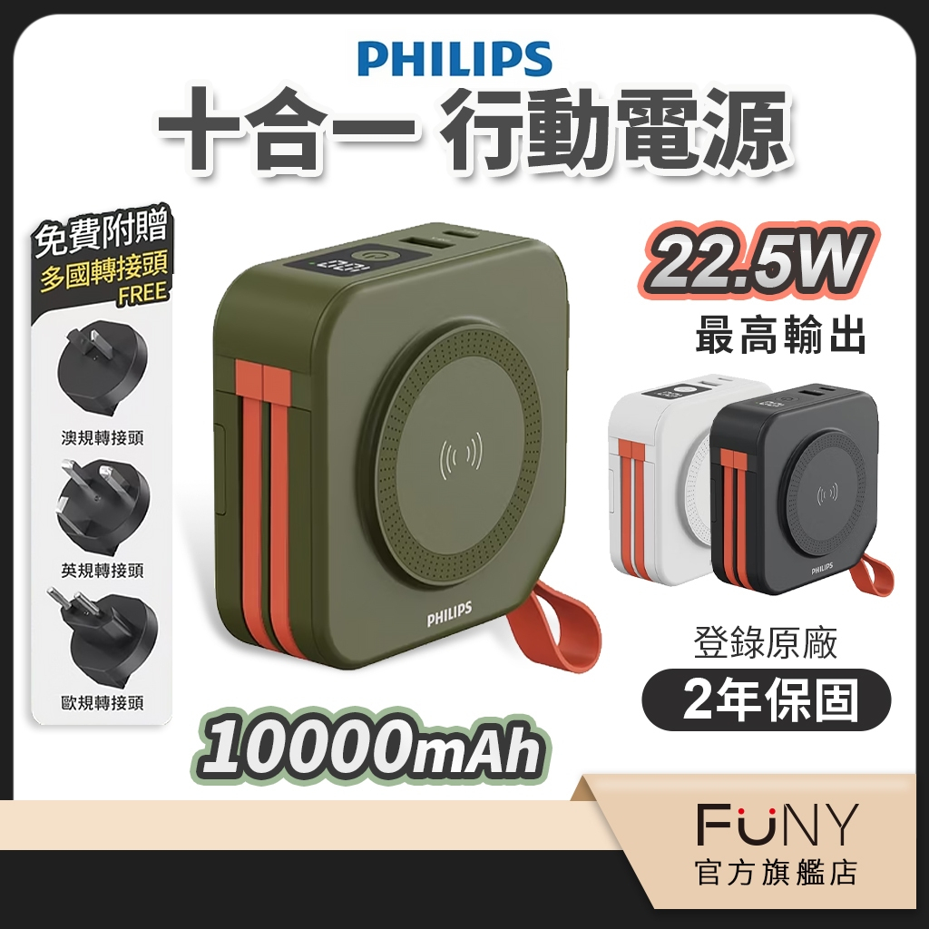 【PHILIPS 飛利浦】十合一無線磁吸行動電源 自帶雙線 雙向快充 超強磁吸力 旅遊上飛機 附萬國轉接頭 好評熱銷中十合一 野性綠|十合一 百搭黑|十合一 漾心粉|十合一 完美白Powerbanks & BatteriesFUNY台灣官方旗艦店