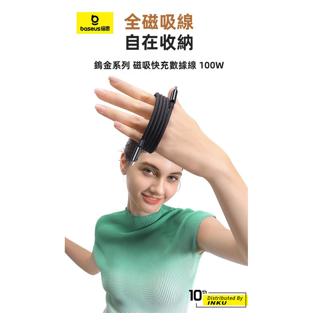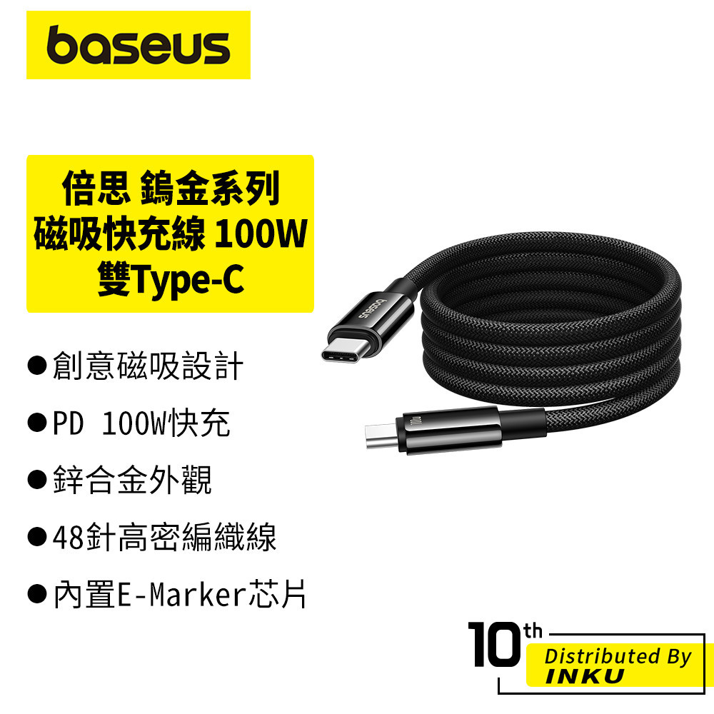 倍思 鎢金磁吸快充充電線 Type-C to Type-C PD 100W 鋅合金數據線 編織線身 便攜收納 1m