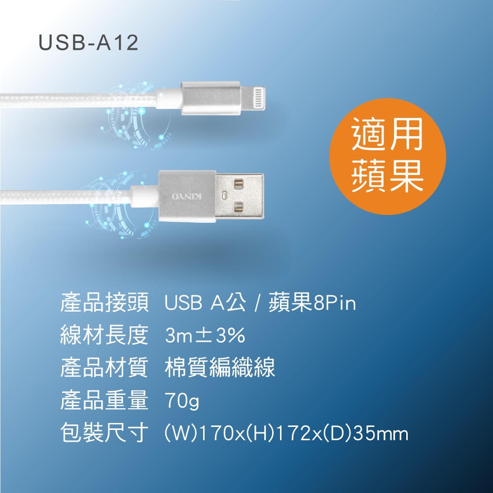 【KINYO官方直營】2.4A Type-C lightning蘋果 鋁合金編織充電傳輸線3M(USB)USBA12 USB To 蘋果|USBC12 USB To Type-CCables, Chargers & ConvertersKINYO官方旗艦店_3C館