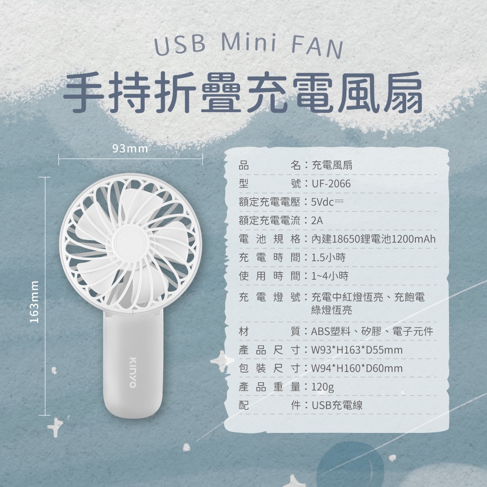 〖KINYO〗 手持折疊充電風扇 (UF) 三檔風速 續航4小時 過充過放保護 | 夏季必備UF2066手持折疊充電風扇USB & Mobile FansKINYO官方旗艦店_家電館