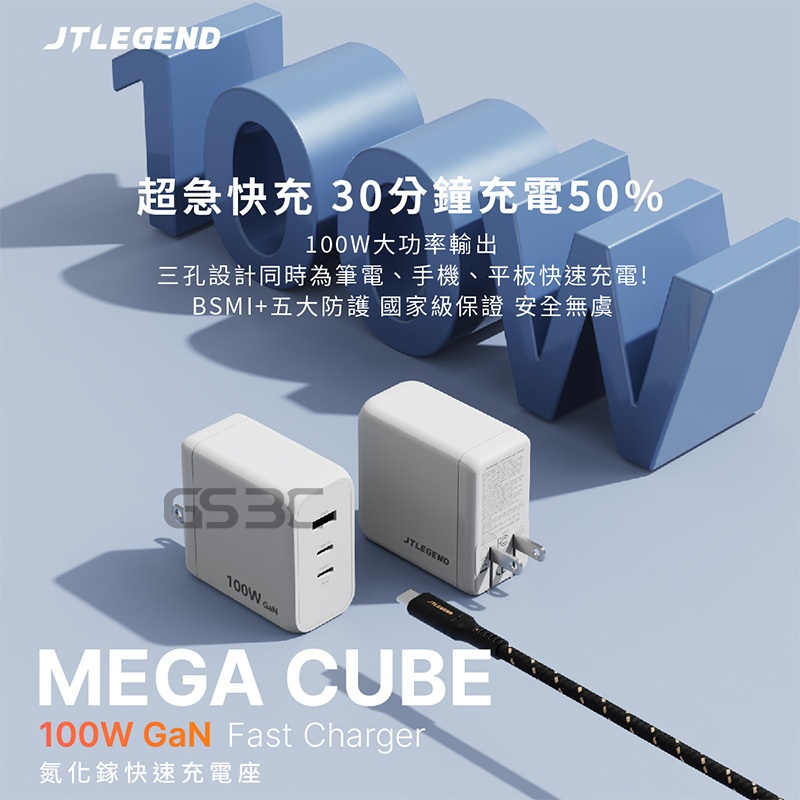 JTLEGEND MEGA CUBE 100W GaN 氮化鎵 閃充 快充 充電器 充電頭 平板 筆電 Switch可充白(USB+USBC*2)Cables, Chargers & ConvertersGS 3C 手機平板配件選品店