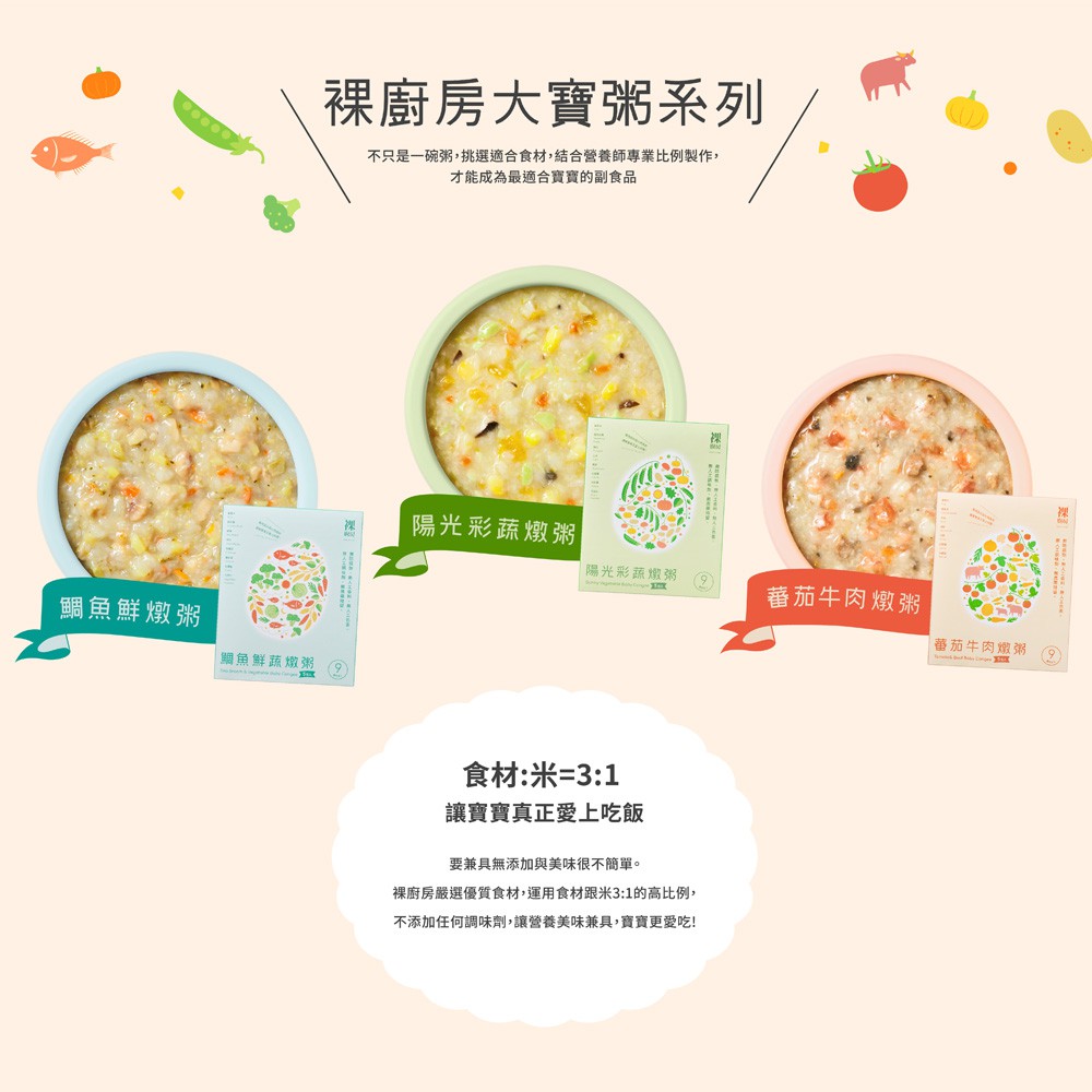 【裸廚房】綜合經濟組-陽光彩蔬+鯛魚鮮蔬+蕃茄牛肉各1盒 大寶寶粥/常溫寶寶粥 (5入/盒)160g 針對9個月以上裸廚房-綜合經濟組(蔬菜+魚+牛)Baby Porridge, Puree & CerealICareU嚴選