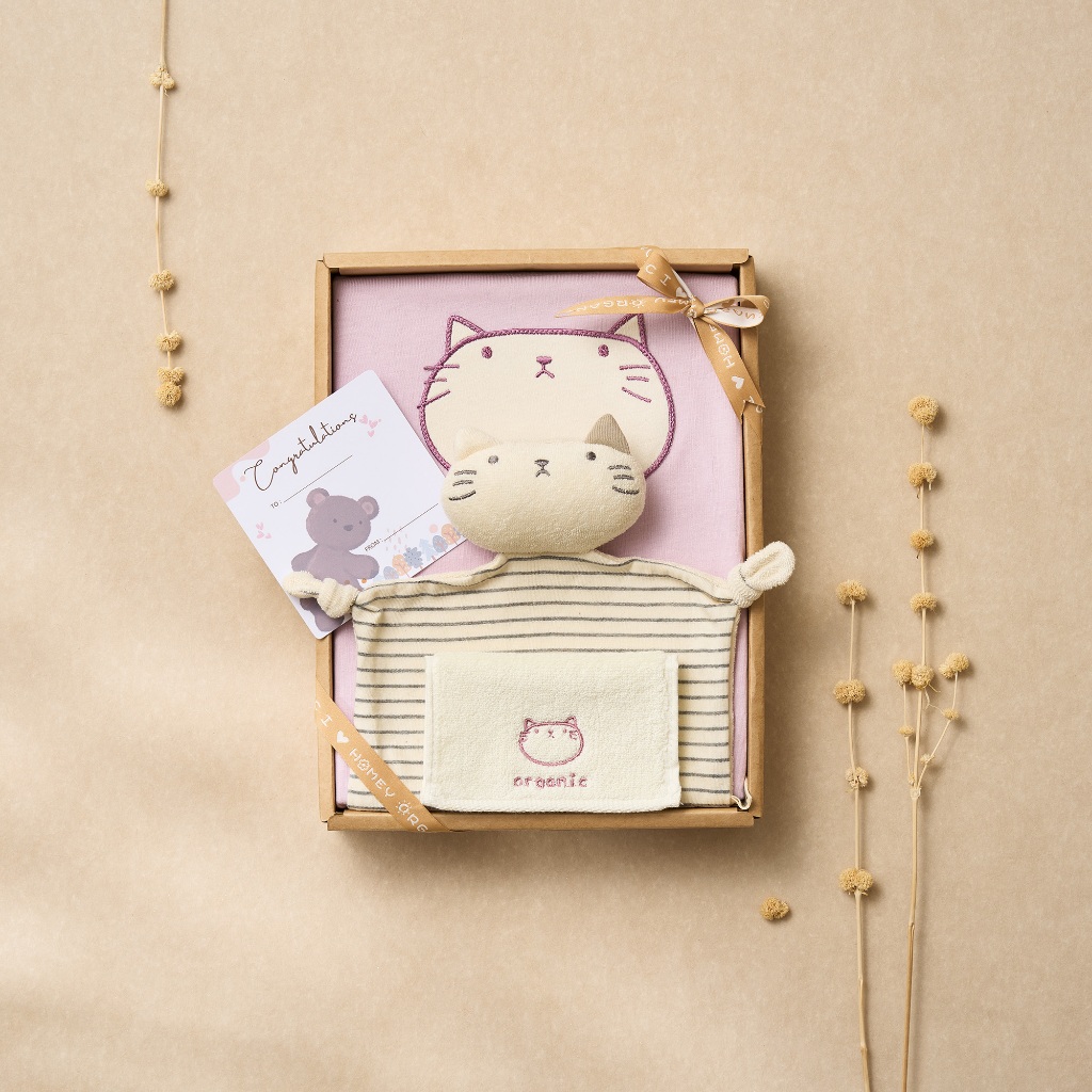 【HomeyOrganic】喵喵彌月禮盒附提袋(粉藍二色) 連身服+安撫巾+迷你巾 GOTS有機認證棉知蓮有機棉MIT