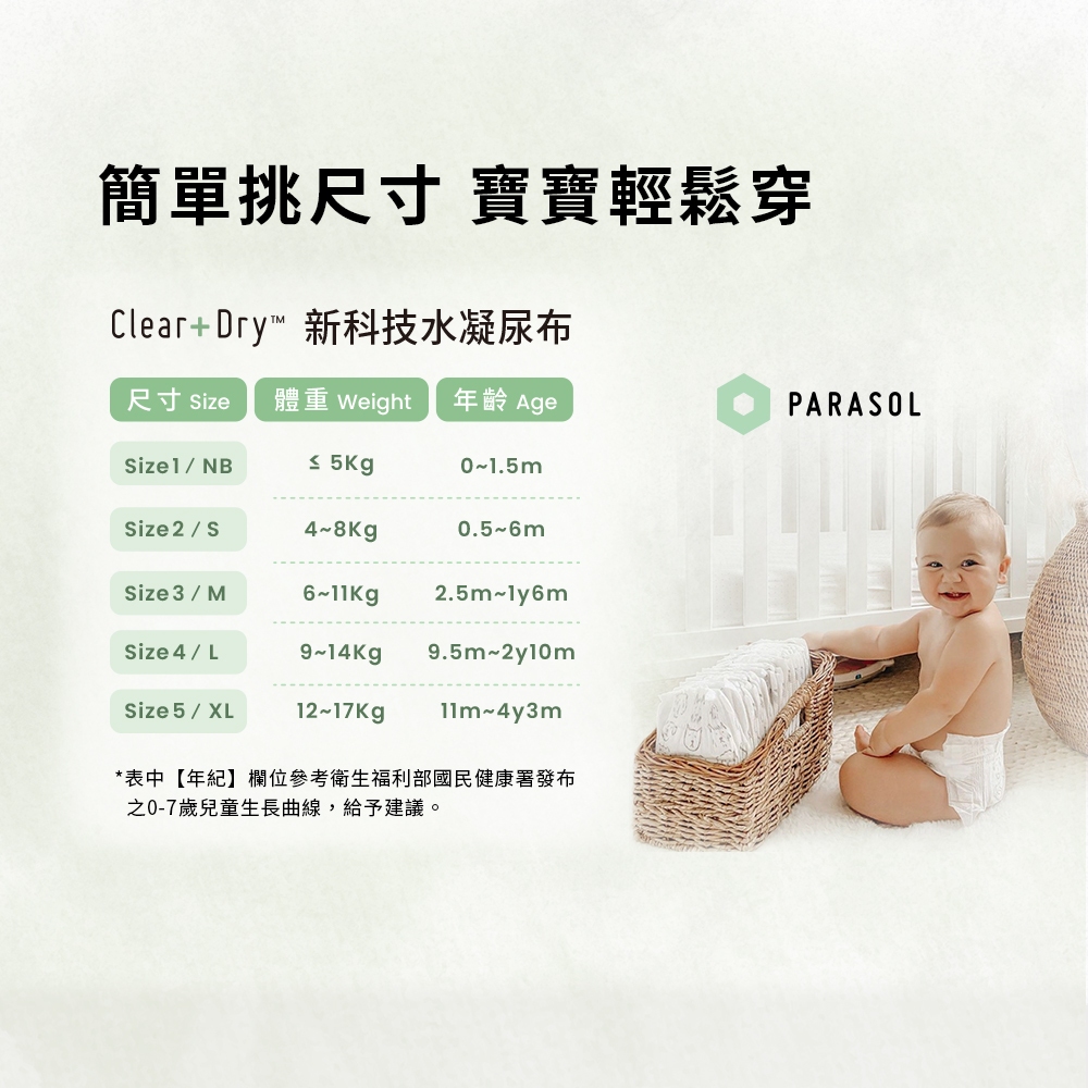 一日體驗|PARASOL Clear + Dry™ 新科技水凝尿布-工藝升級版(輕巧包)|古北町總代理1號- NB ( 14片 )|2號- S ( 12片 )|3號- M ( 10片 )|4號- L ( 8片 )|5號- XL( 6片 )Disposable Diapershegen•PARASOL•färska•Poled 古北町官方總代理