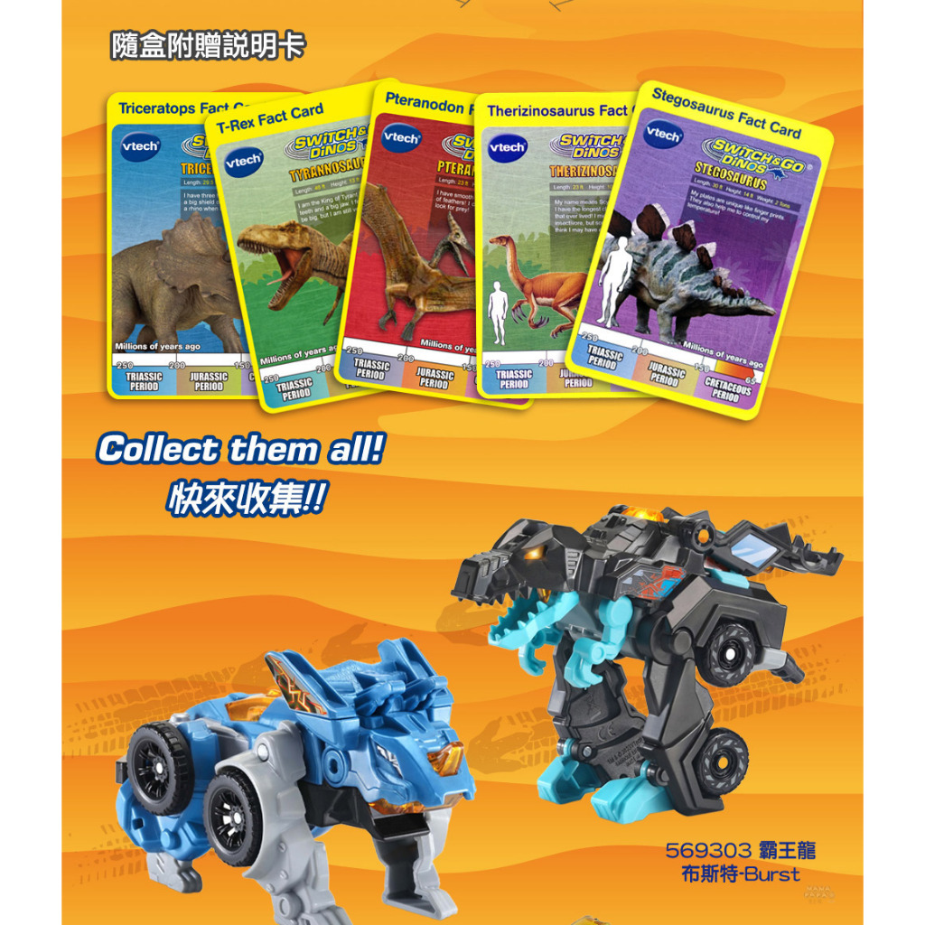 Vtech 聲光變形恐龍車(共10款)三角龍-圖摩爾|迅猛龍-班奈特|霸王龍-布雷茲|霸王龍-布斯特|三角龍-克拉斯|鐮刀龍-賽爾|翼龍-索爾|劍龍-薩拉姆|霸王龍-魔爪|棘龍-雷霆Toy Vehiclesmama-papa親子網