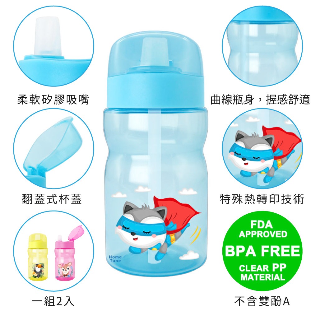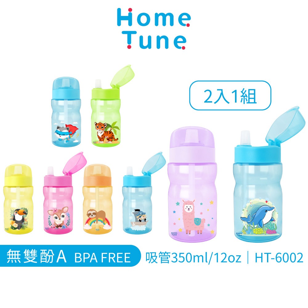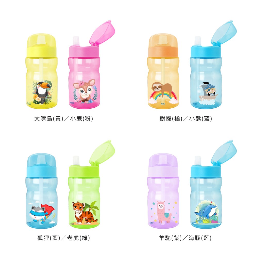 Home Tune家音 翻蓋吸管式水壺350ml(一組2入|無雙酚A水壺兒童水壺吸管水壺透明水壺隨身瓶_HT-6002狐狸(藍)/老虎(綠)|樹懶(橘)/小熊(藍)|大嘴鳥(黃)/小鹿(粉)|羊駝(紫)/海豚(藍)UtensilsHome Tune家音