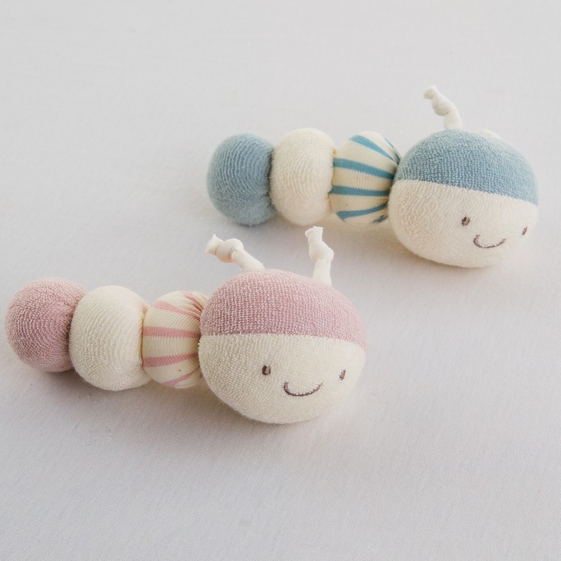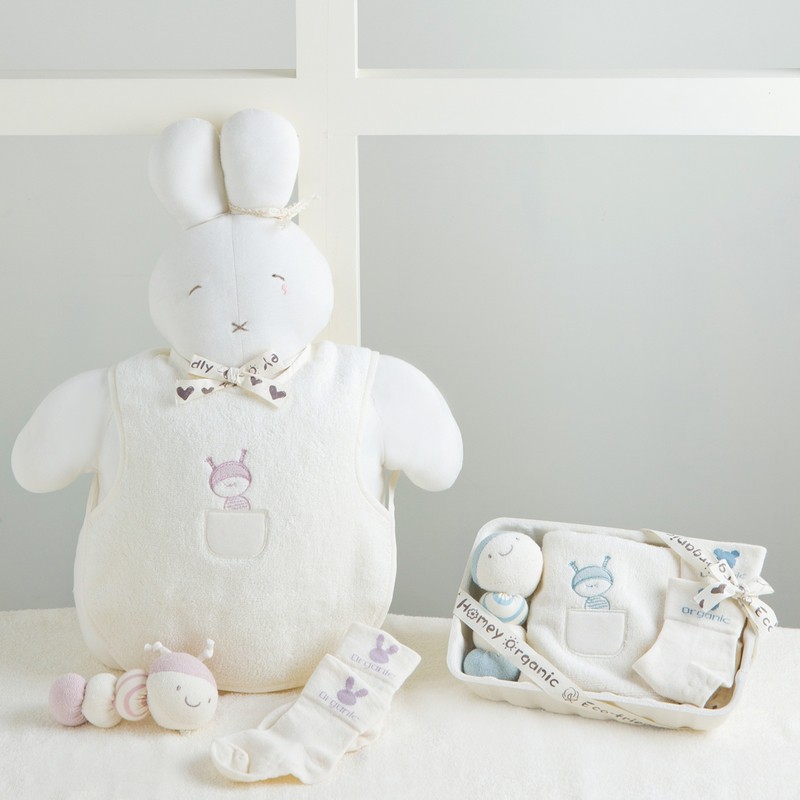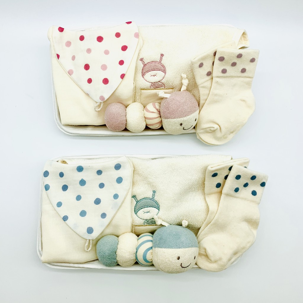 【HomeyOrganic】毛毛蟲用品彌月禮盒4件組附提袋(粉藍2色) 安撫玩偶+圍兜+墊巾+短襪 知蓮有機棉 台灣製粉色|藍色HomeyOrganic 知蓮有機棉