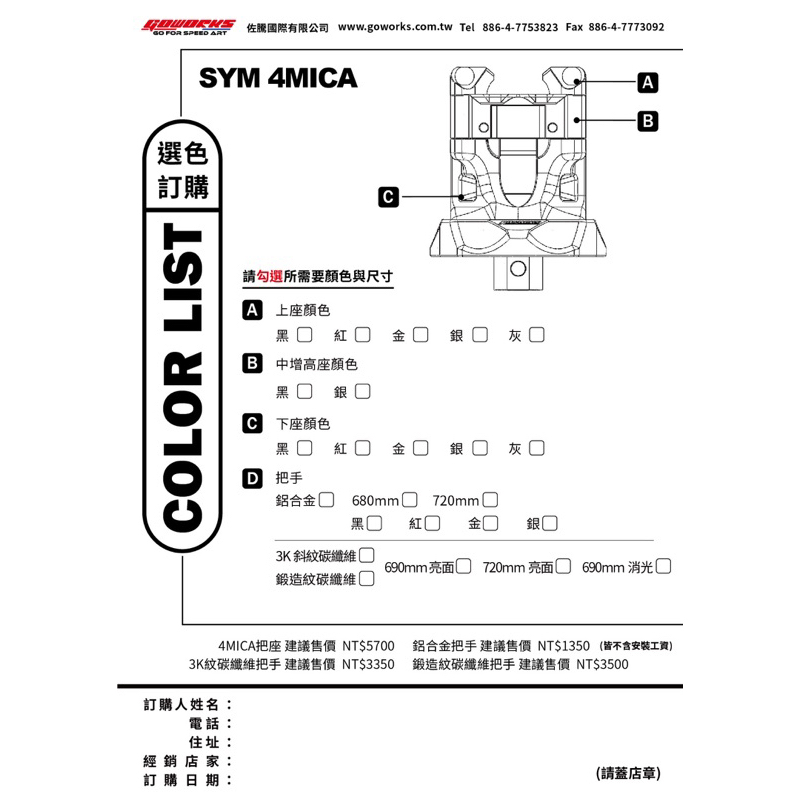 【GOWORKS】 4MICA專用把座 SYM 螞蟻 增高後移冠座 龍頭座 外露把黑色|紅色|金色|銀色|深灰色Body & FrameGOWORKS