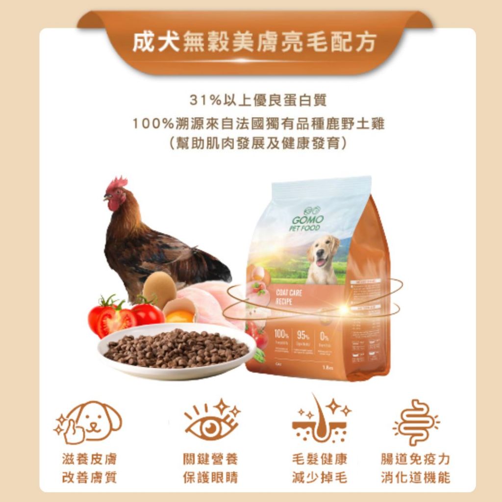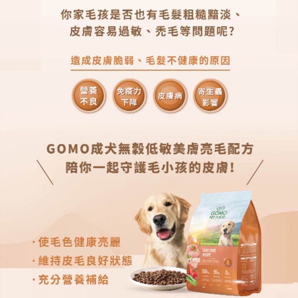 【GOMO PET FOOD】GOMO狗飼料 無穀美膚亮毛配方 1.8KG 成犬用【GOMO PET FOOD】GOMO狗飼料 無穀美膚亮毛配方 1.8KG 成犬用Dog FoodGOMO PET FOOD品牌旗艦店