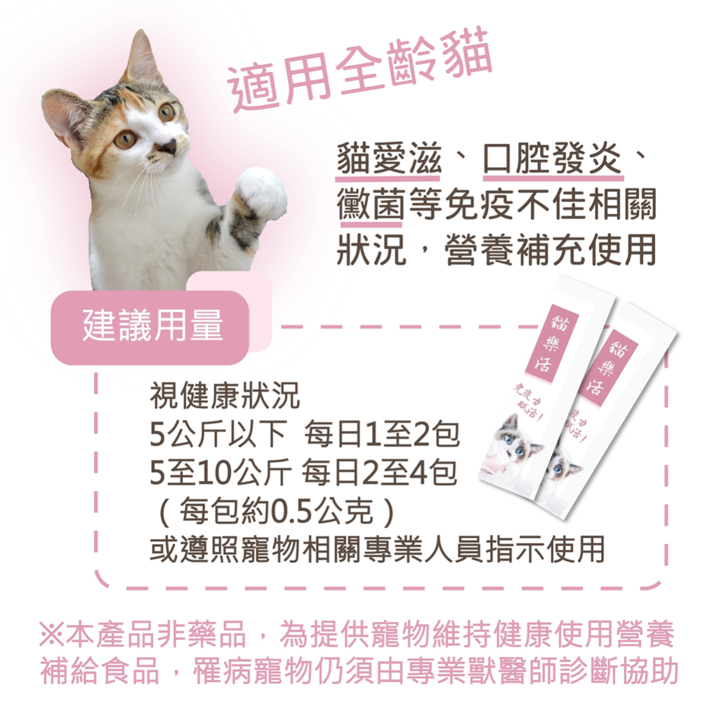 [新包裝]悅貓樂 貓樂活 ~貓用日常補充營養品(愛滋貓,口齦炎,黴菌)高純度多醣體/乳鐵蛋白/牛磺酸/益生菌