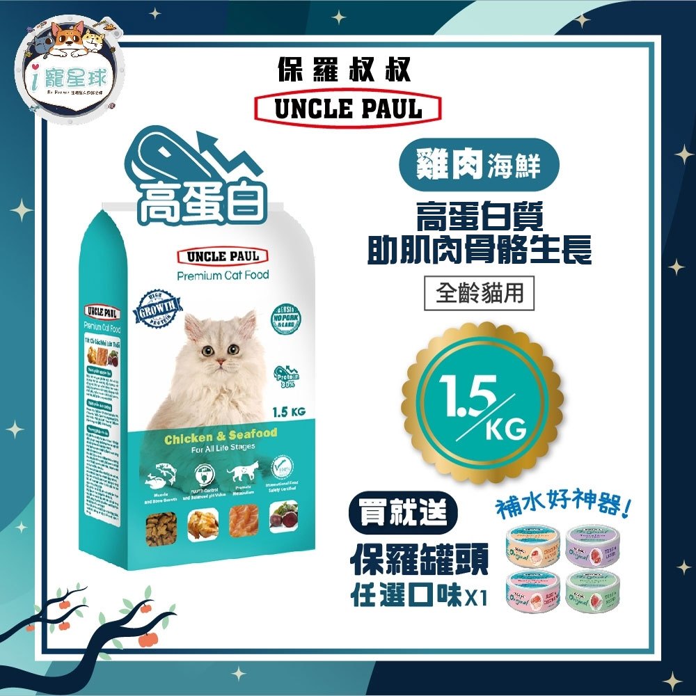 【下單即送罐頭】保羅叔叔優質貓糧 貓飼料 -雞肉海鮮 1.5KG -成貓 全齡貓 全種貓 貓狗園 浪浪 台灣製(藍)雞肉海鮮,1.5kg|(紫)海鮮燕麥,1.5kg|(黃)雞肉糙米,1.5kg|7-11限2包/全家、蝦店限3包,1.5kgCat Foodi寵星球