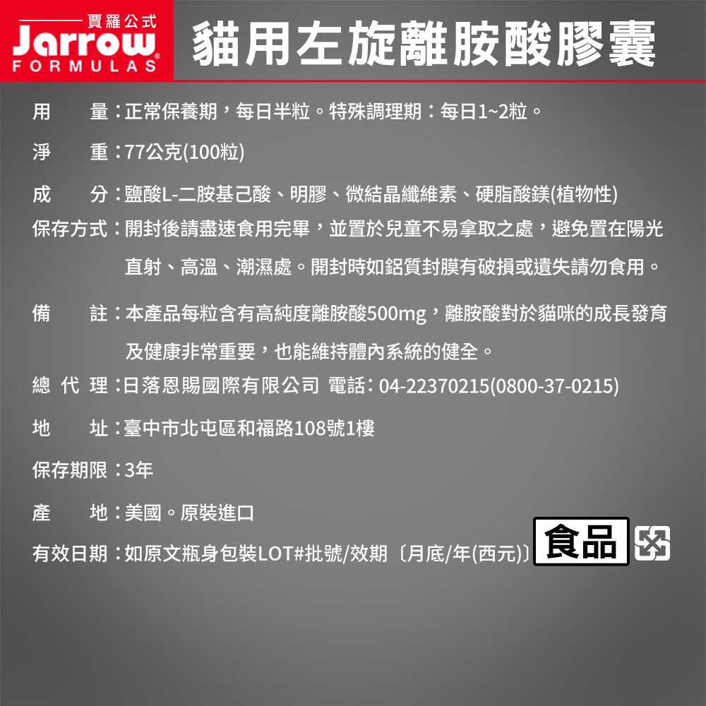 [現貨] Jarrow賈羅公式 貓用左旋離胺酸膠囊(100粒/瓶) / 狗貓用魚油膠囊(180粒/瓶)【官方直營】Piping Rock狗貓用魚油20粒裝|Jarrow賈羅公式 離胺酸膠囊100粒|Piping Rock 離胺酸粉340克|Piping Rock狗貓用魚油180粒Vitamins & SupplementsJarrow賈羅公式 x Nature’s Truth綠萃淨 | 官方直營