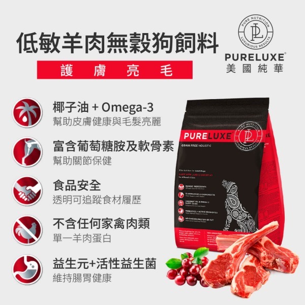 PureLUXE 美國純華天然無穀犬糧 | 低敏羊肉無穀犬糧 【免運】4LB/22LB 無穀犬 狗乾糧 狗飼料 狗主食4LB (1.8kg) 超取限2包|22LB (限宅配)Dog FoodiCat 寵喵樂