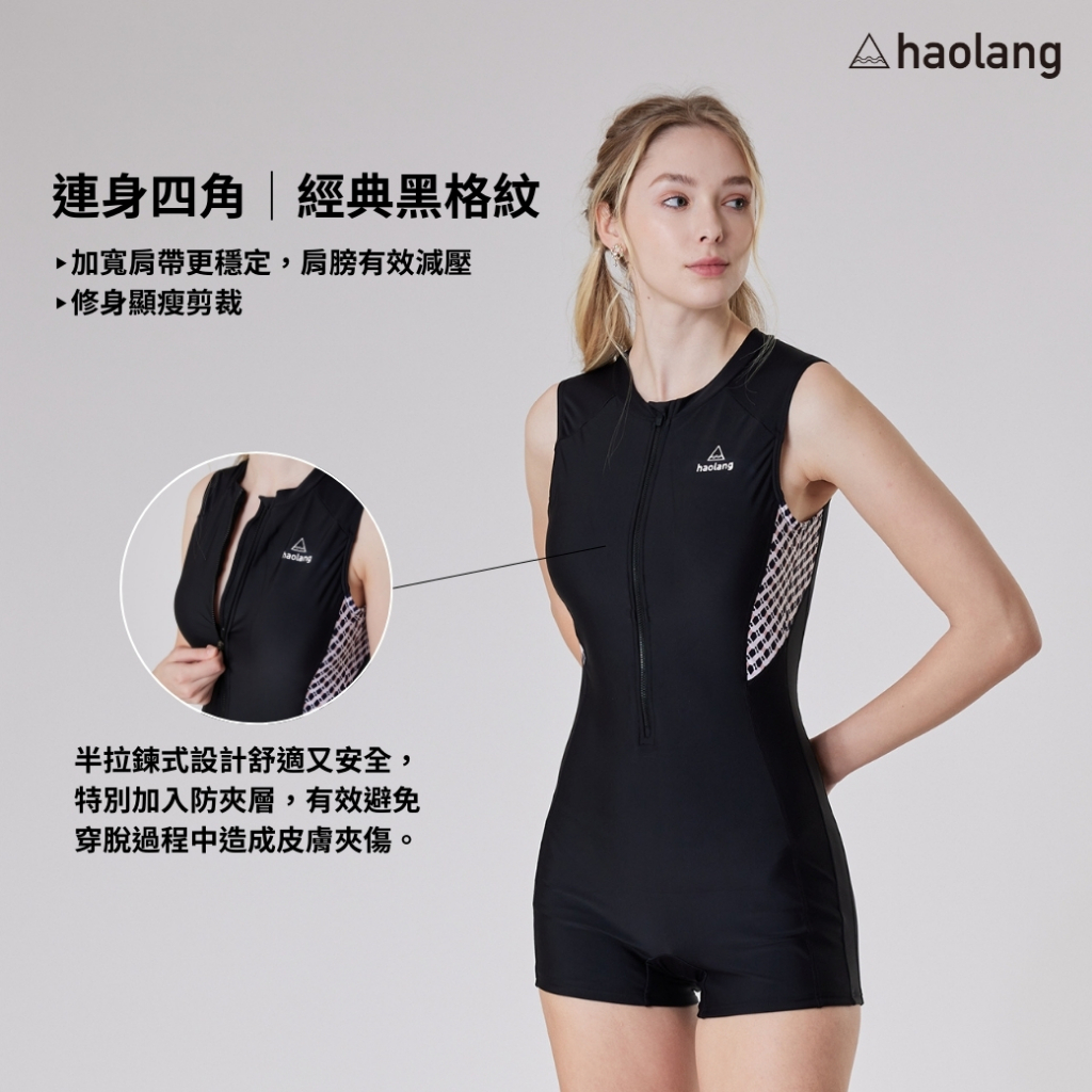 Haolang 經典黑格紋拉鍊連身泳衣/游泳/泡湯/溫泉/腰部修身M|L|XL|2LSwimming AttireHaolang浩浪泳裝