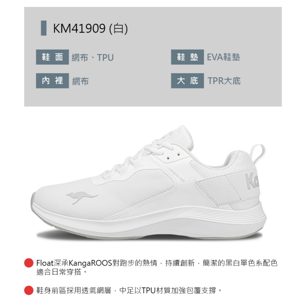【KangaROOS美國袋鼠鞋】男鞋 FLOAT WR 防潑水輕量跑鞋 透氣吸濕 (白-KM41909)25.5cm|26cm|26.5cm|27cm|27.5cm|28cm|29cmRunning ShoesKangaROOS 美國袋鼠鞋 官方旗艦店