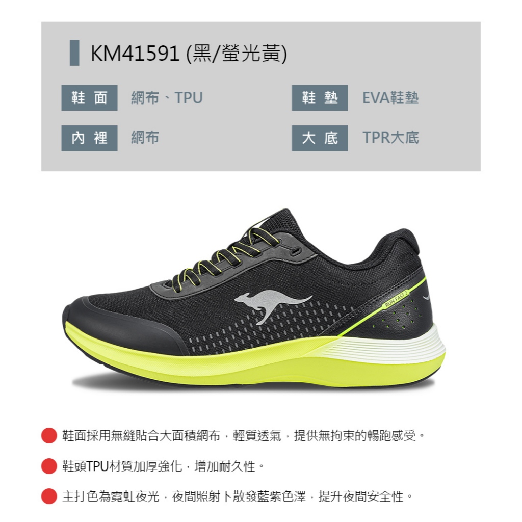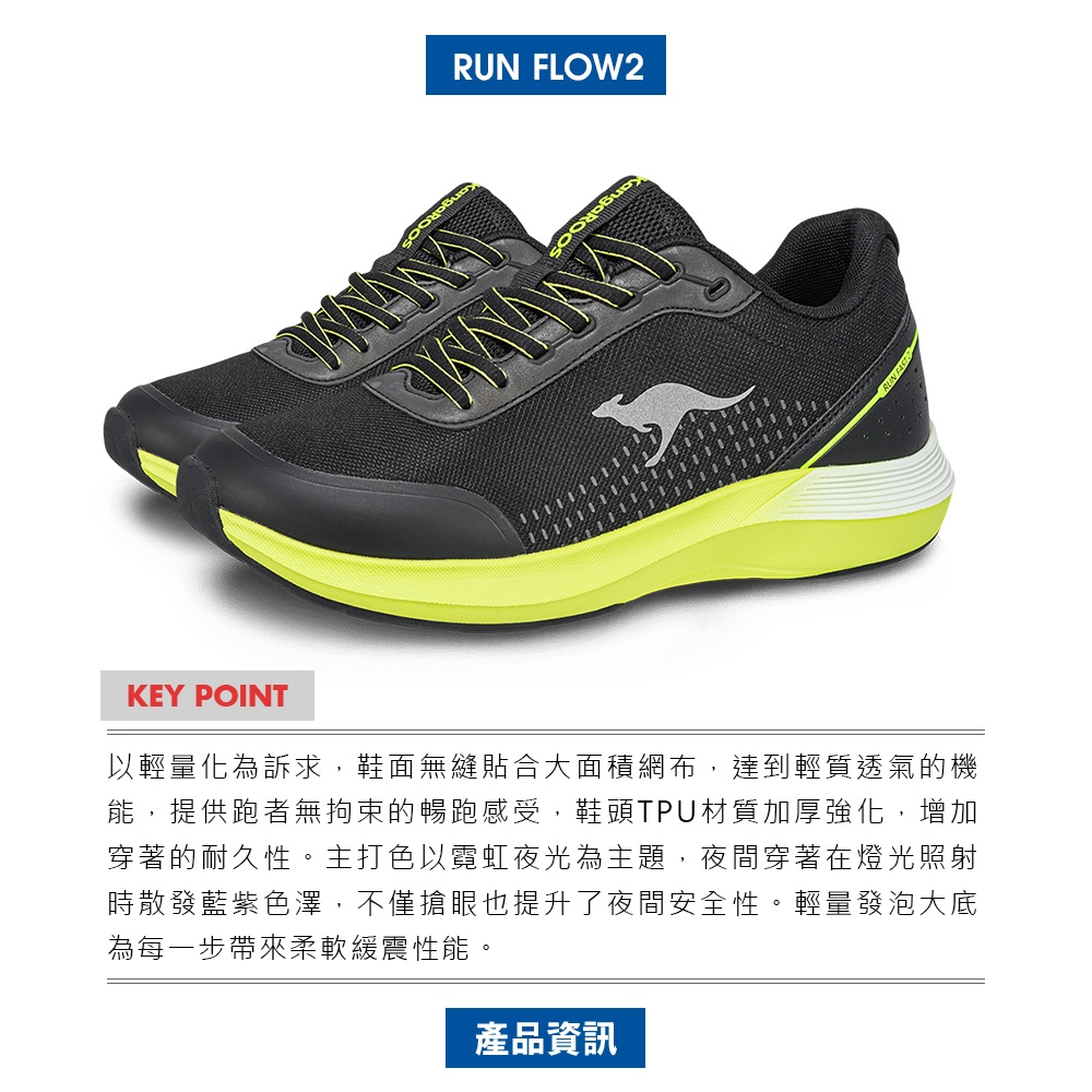 【KangaROOS美國袋鼠鞋】男鞋 RUN FLOW 2 超輕量跑鞋 透氣反光緩震 (黑/螢光黃-KM41591)25.5cm|26cm|26.5cm|27cm|27.5cm|28cm|29cmRunning ShoesKangaROOS 美國袋鼠鞋 官方旗艦店