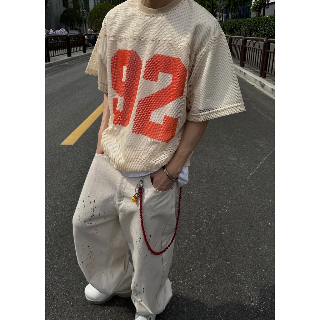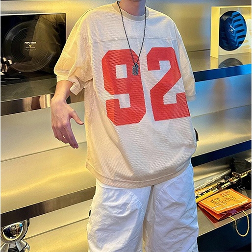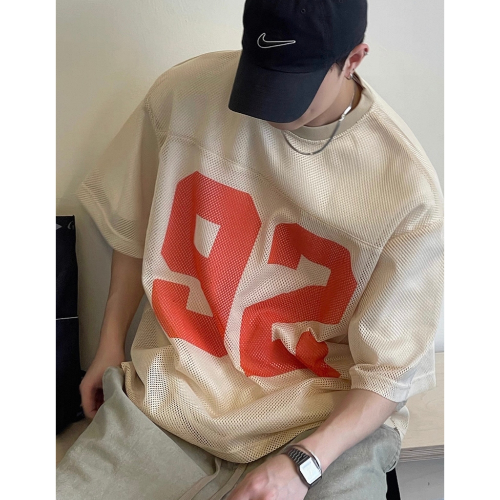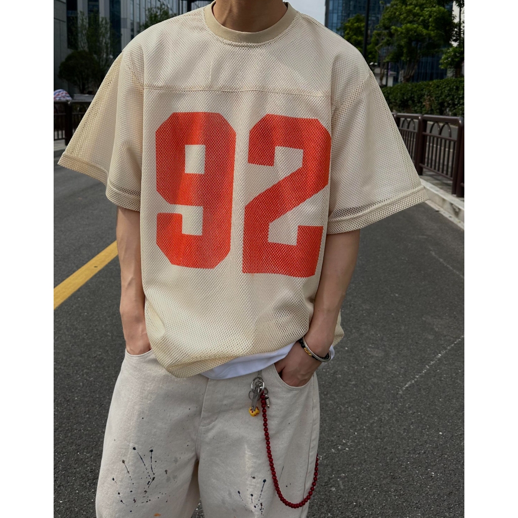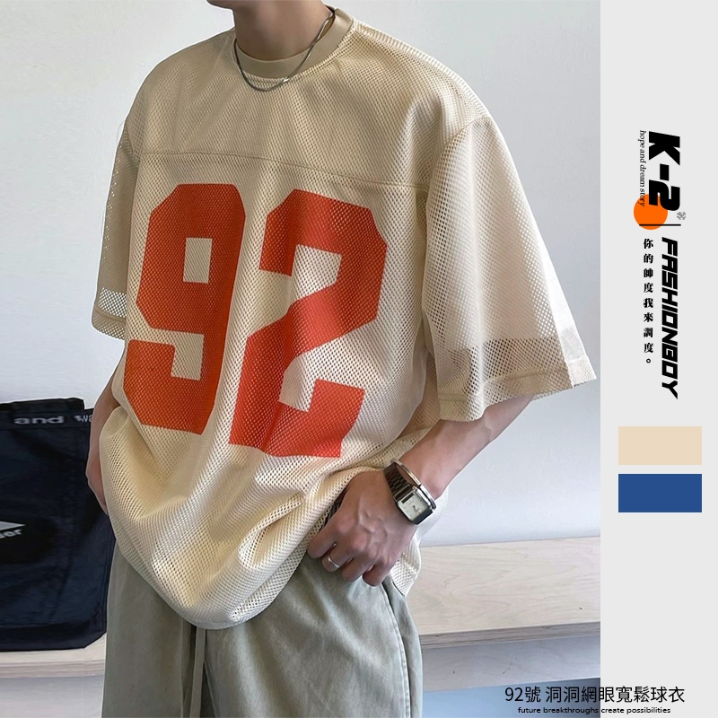 【K-2】92號 洞洞網眼 寬鬆球衣 透視感 美式 復古 短袖球衣 寬鬆 球衣 透氣 Y2K球衣 K2【JT52】杏色,M|杏色,L|藍色,M|藍色,LJerseysK-2 Fashionboy