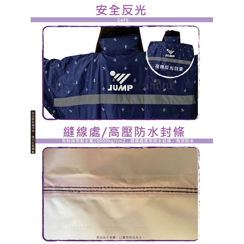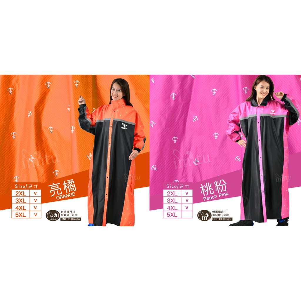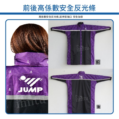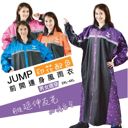 JUMP 印花配色 反光延伸加倍 前開連身一件式風雨衣 (2XL~5XL)2XL,黑寶藍|2XL,黑亮橘|2XL,黑紫|2XL,黑桃粉|3XL,黑寶藍|3XL,黑亮橘|3XL,黑紫|3XL,黑桃粉|4XL,黑寶藍|4XL,黑亮橘|4XL,黑紫|4XL,黑桃粉|5XL(加大尺寸),黑寶藍|5XL(加大尺寸),黑亮橘|5XL(加大尺寸),黑紫|5XL(加大尺寸),黑桃粉Rain Coatsimitu 米圖