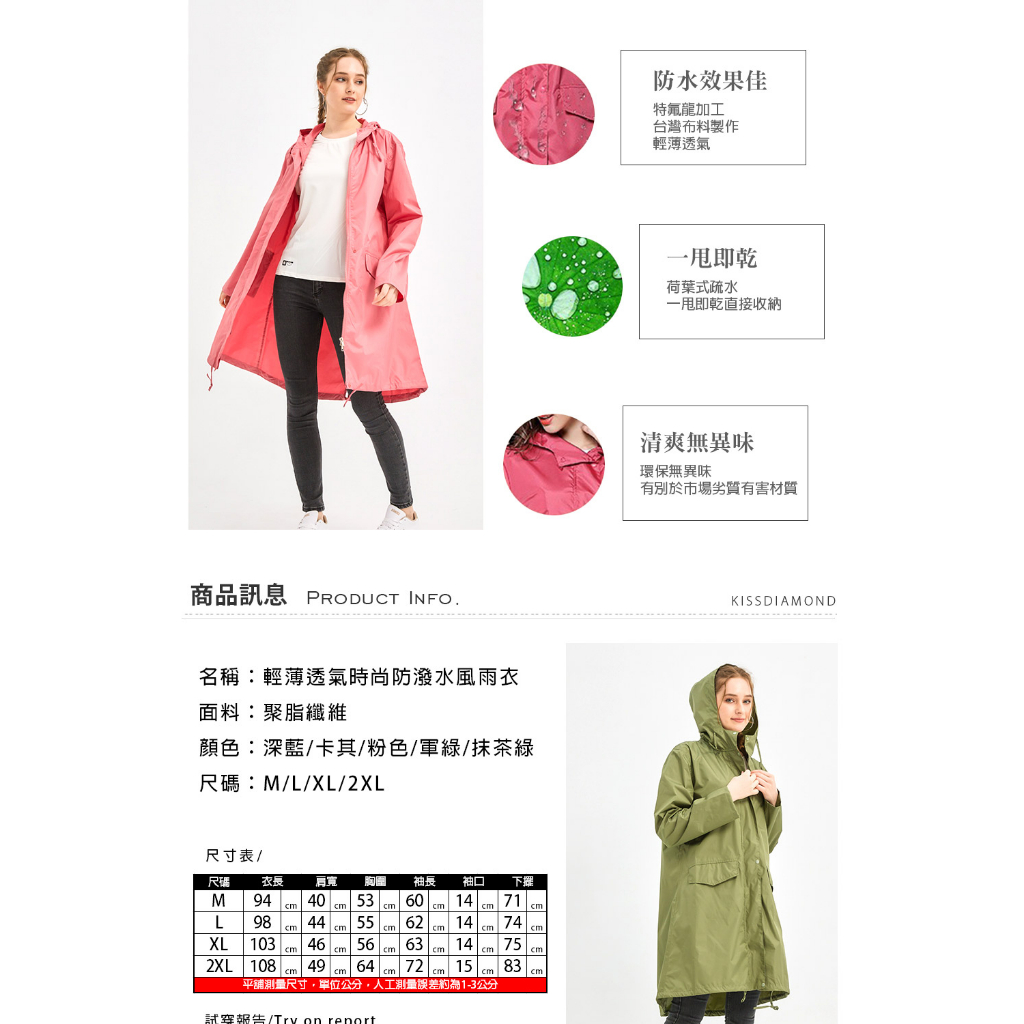 輕薄透氣時尚防潑水風雨衣(KD-203)深藍,M|深藍,L|深藍,XL|深藍,2XL|卡其,M|卡其,L|卡其,XL|卡其,2XL|粉色,M|粉色,L|粉色,XL|粉色,2XL|軍綠,M|軍綠,L|軍綠,XL|軍綠,2XL|抹茶綠,L|抹茶綠,XL|抹茶綠,M|抹茶綠,2XLRain CoatsKISSDIAMOND 嚴選服飾