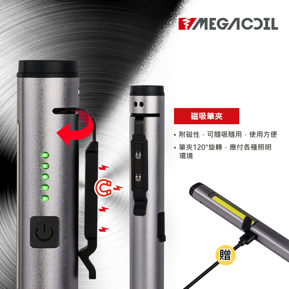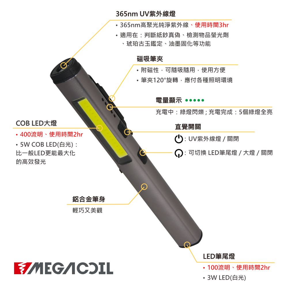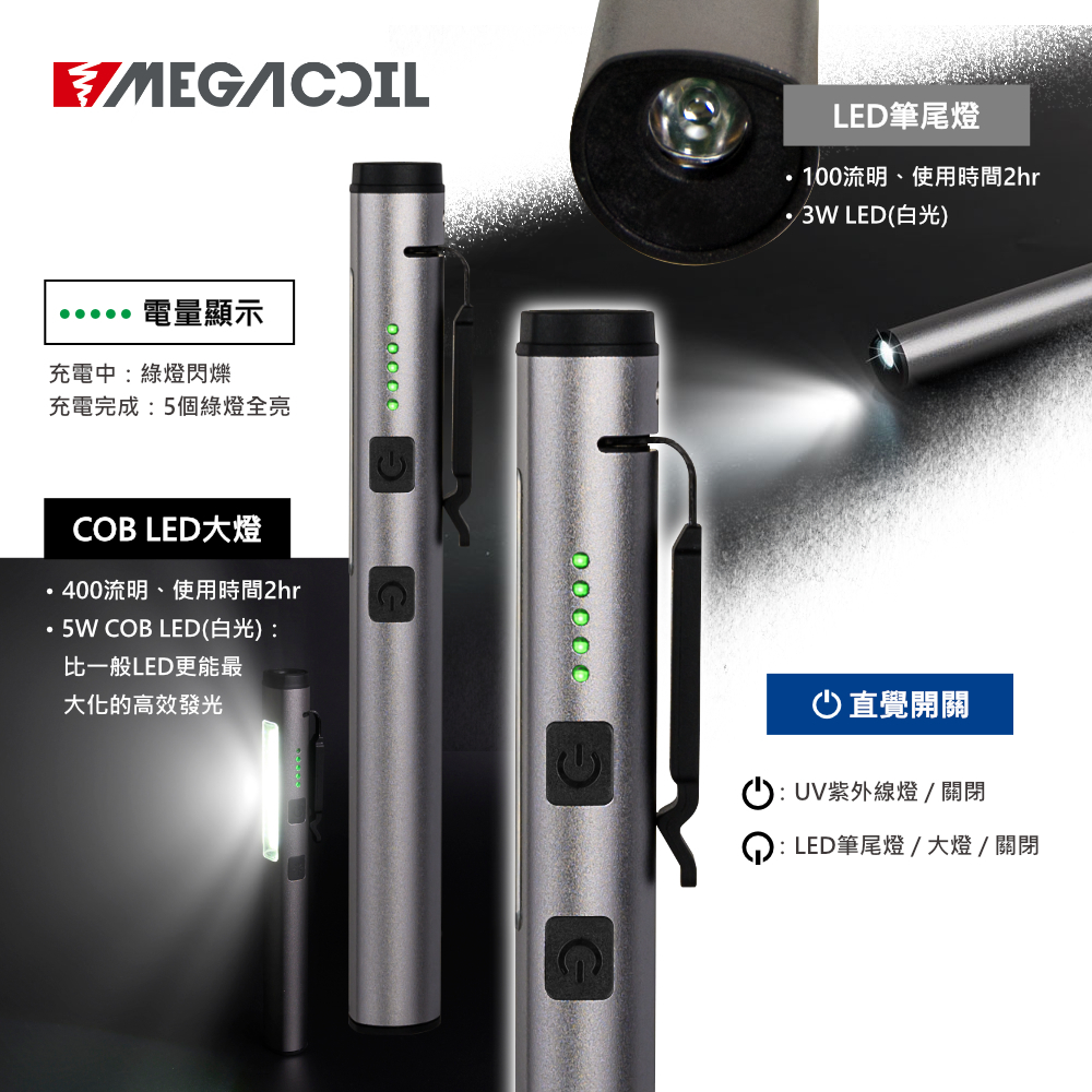 【MEGACOIL】3光源 多功能筆燈 筆型手電筒 365nm UV光線筆 驗鈔燈 磁吸工作燈 COB LED USB銀河灰|火焰紅Camping & HikingLaBear 樂博工具