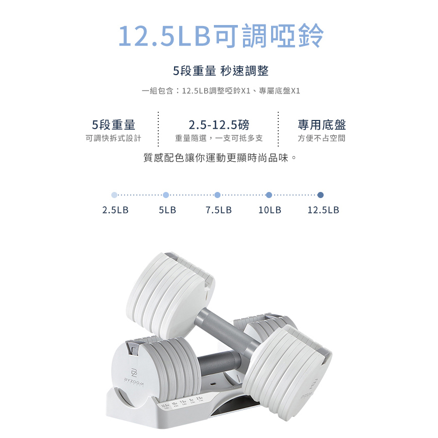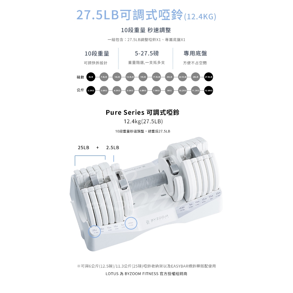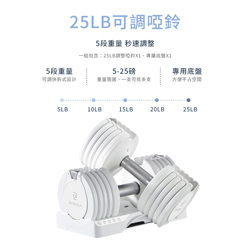 BYZOOM Fitness Pure Series 可調式啞鈴 25LB 5段重量秒速調整 宅配免運 公司貨 一年保固白色5.6公斤啞鈴2支+槓鈴桿*1|白色12.4公斤(27.5磅)啞鈴1支|黑色6公斤/11.3公斤啞鈴收納架|黑色槓鈴桿 僅適同牌6/11.3公斤啞鈴|黑色11.3公斤(25磅)啞鈴1支|白色5.6公斤(12.5磅)啞鈴1支|白色11.3公斤(25磅)啞鈴1支|白色25公斤(55磅)啞鈴1支|白色6公斤/11.3公斤啞鈴收納架|白色25公斤(55磅)啞鈴收納架|愛迪達台灣製運動護腰L/XL 機能型護具|愛迪達台灣製運動護腰S/M機能型護具系列|白色槓鈴桿 僅適同牌6/11.3公斤啞鈴|白色站立式收納健身椅x1|黑色站立式收納健身椅x1|台灣製止滑橡膠健身巧拼墊14mm 8入組|黑色12.4公斤(27.5磅)啞鈴1支|黑色5.6公斤(12.5磅)啞鈴1支|黑色5.6公斤啞鈴2支+槓鈴桿*1|黑色11.3公斤(25磅)啞鈴2支|白色11.3公斤(25磅)啞鈴2支|黑色12.4公斤(27.5磅)啞鈴2支|白色12.4公斤(27.5磅)啞鈴2支|白色5.6公斤(12.5磅)啞鈴2支|黑色5.6公斤(12.5磅)啞鈴2支Fitness EquipmentLOTUS FITNESS