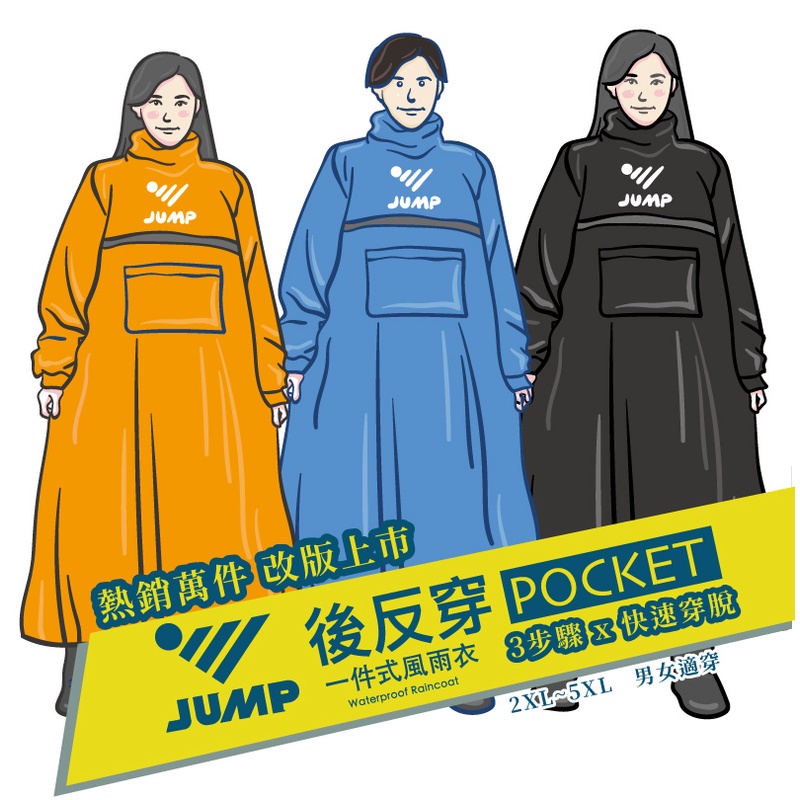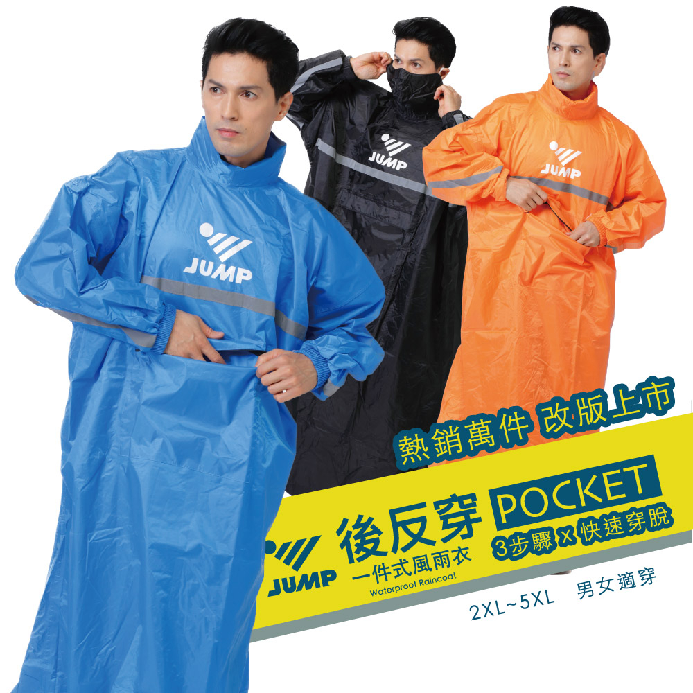 JUMP 將門口袋POCKET+ 後反穿全方位反光風雨衣亮橙橘,3XL|亮橙橘,4XL|亮橙橘,5XL|暗夜黑,2XL|暗夜黑,5XL|活力藍,2XL|活力藍,3XL|活力藍,4XL|暗夜黑,3XL|暗夜黑,4XL|活力藍,5XL|亮橙橘,2XLRain Coatsimitu 米圖