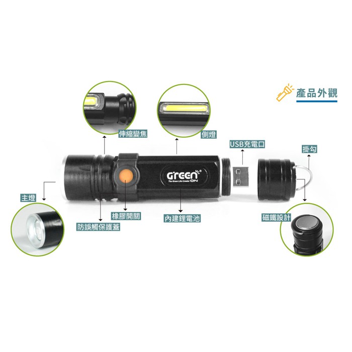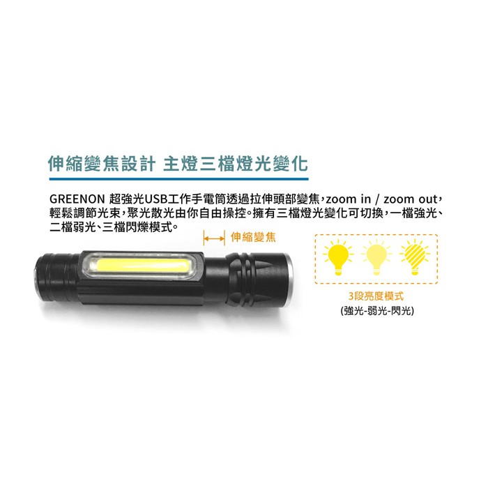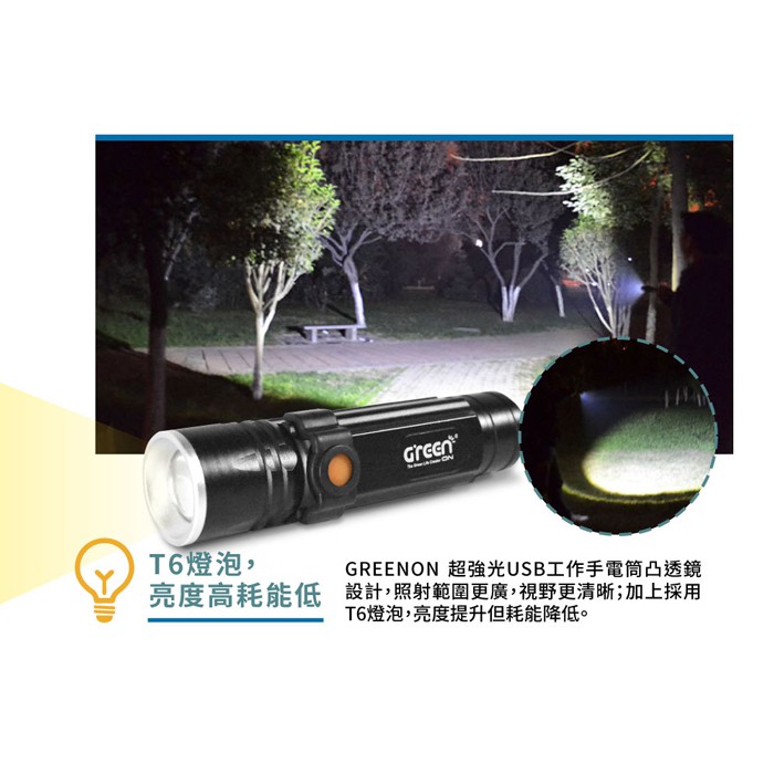 【GREENON】超強光USB工作手電筒 伸縮變焦 USB充電 防水等級IPX6 T6超強光燈珠【GREENON】超強光USB工作手電筒 伸縮變焦 USB充電 防水等級IPX6 T6超強光燈珠Camping & HikingGreenon橘能