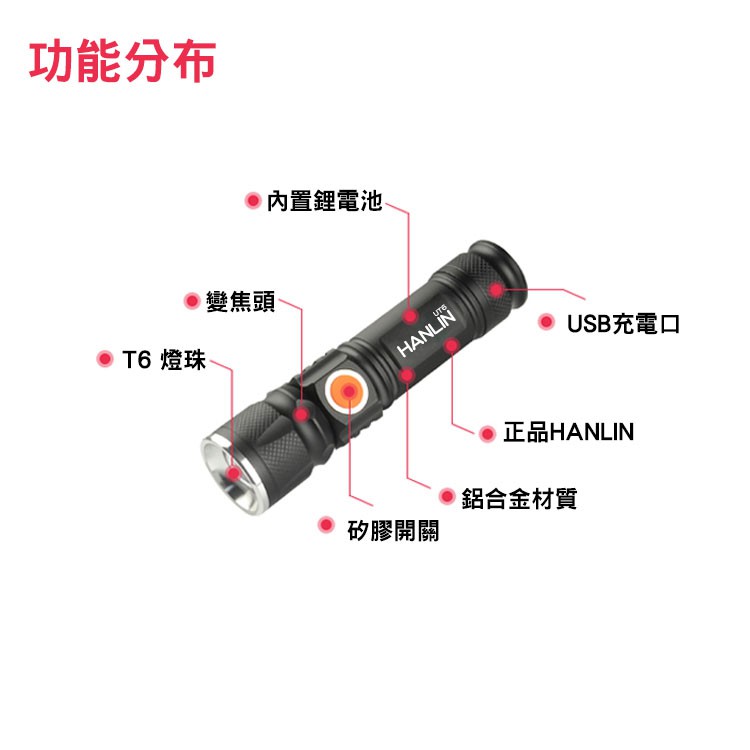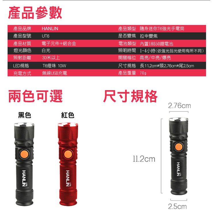 HANLIN-UT6 隨身迷你T6強光手電筒-伸縮變焦(USB直充) 鋁合金 伸縮變焦 USB 免電池 露營 居家黑色|紅色Camping & HikingHANLIN官方旗艦店