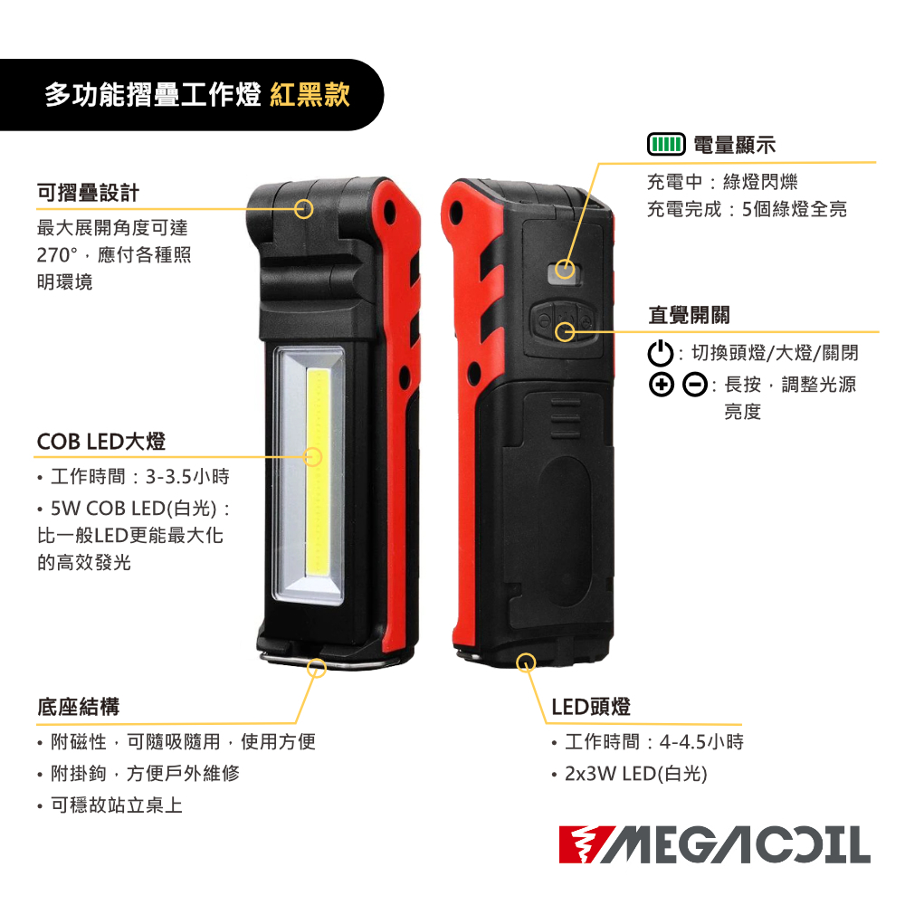 【MEGACOIL】摺疊工作燈 360度手把 磁吸工作燈 LED摺疊燈 便攜工作燈 露營燈 手電筒多功能摺疊工作燈-紅黑款|360度手把 磁吸工作燈Camping & HikingLaBear 樂博工具