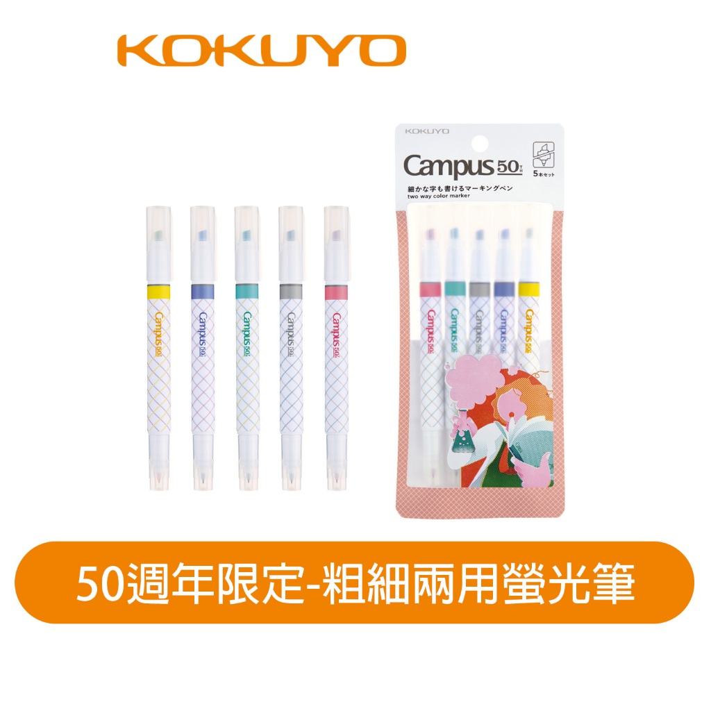 【日本KOKUYO】50週年限定-粗細兩用螢光筆單隻 粉/綠/灰/深藍/黃 5種顏色選擇 日本製黃|粉|綠|灰|深藍HighlightersKOKUYO台灣總代理官方旗艦店