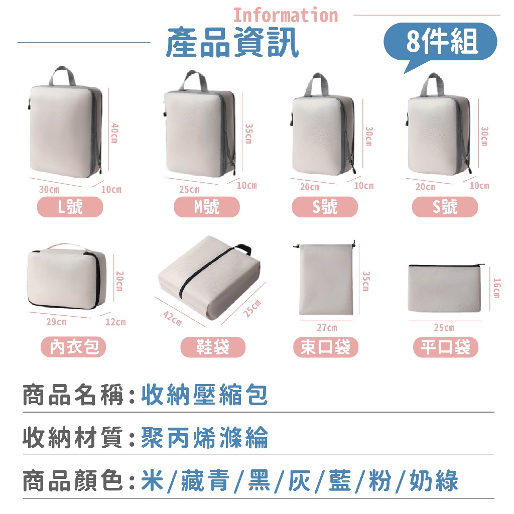 【旅行收納】旅行收納壓縮包 八件組收納包 壓縮袋 旅行收納袋 行李收納袋 旅行袋 外出旅行收納壓縮袋3件加贈鞋套組-米色|壓縮袋3件加贈鞋套組-粉色|壓縮袋3件加贈鞋套組-奶綠|壓縮袋3件加贈鞋套組-黑色|壓縮袋3件加贈鞋套組-灰色|壓縮袋3件加贈鞋套組-藏青色|壓縮袋3件加贈鞋套組-藍色|八件套-米色|八件套-粉色|八件套-奶綠|八件套-黑色|八件套-灰色|八件套-藏青色|八件套-藍色Travel OrganizersLOHOY品牌館