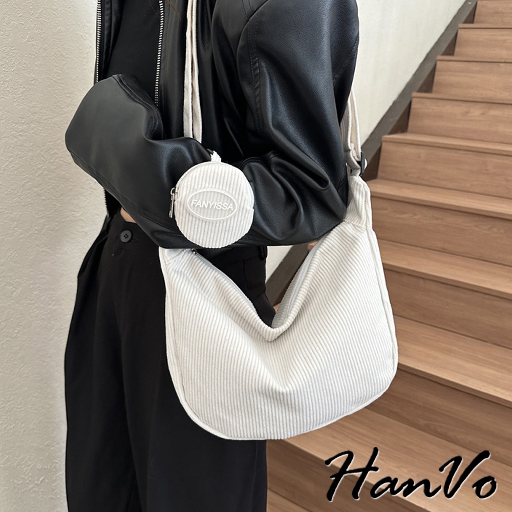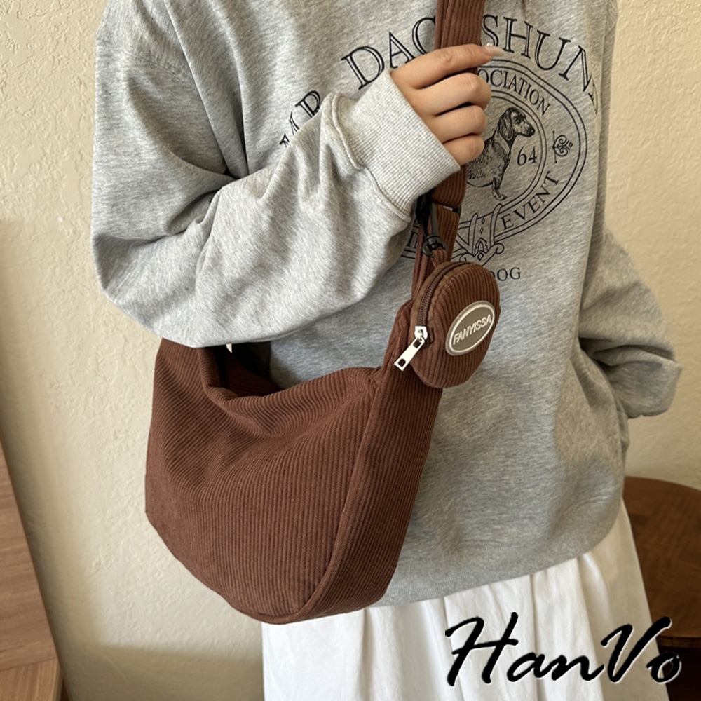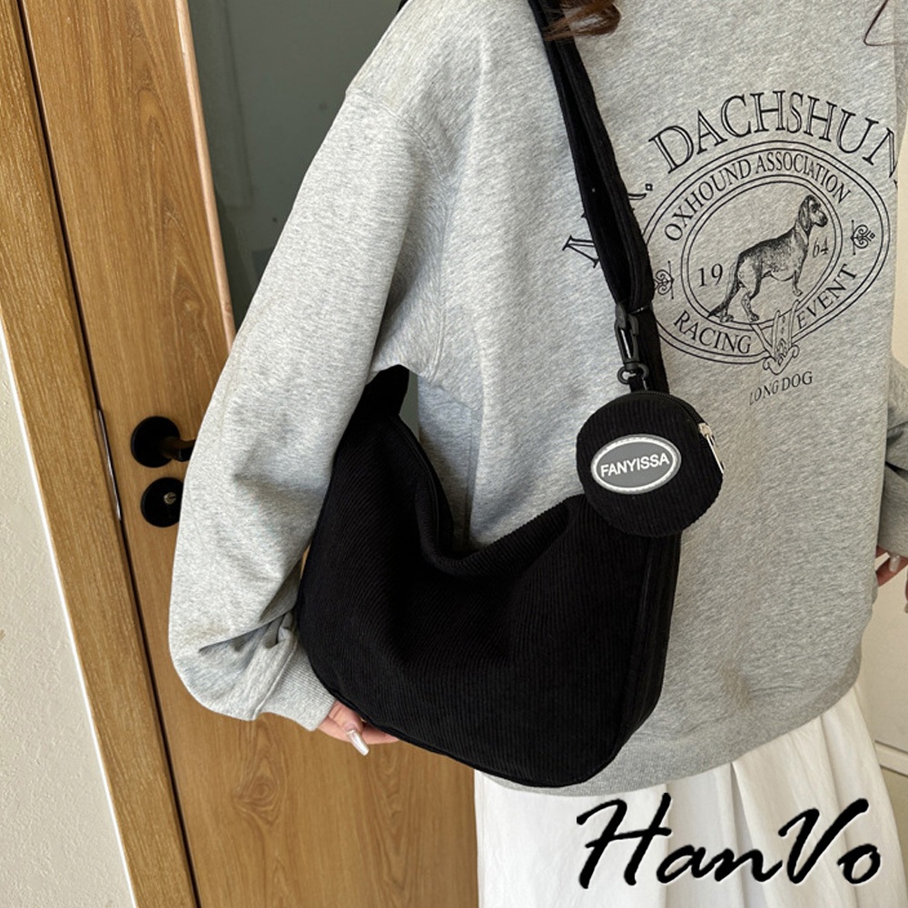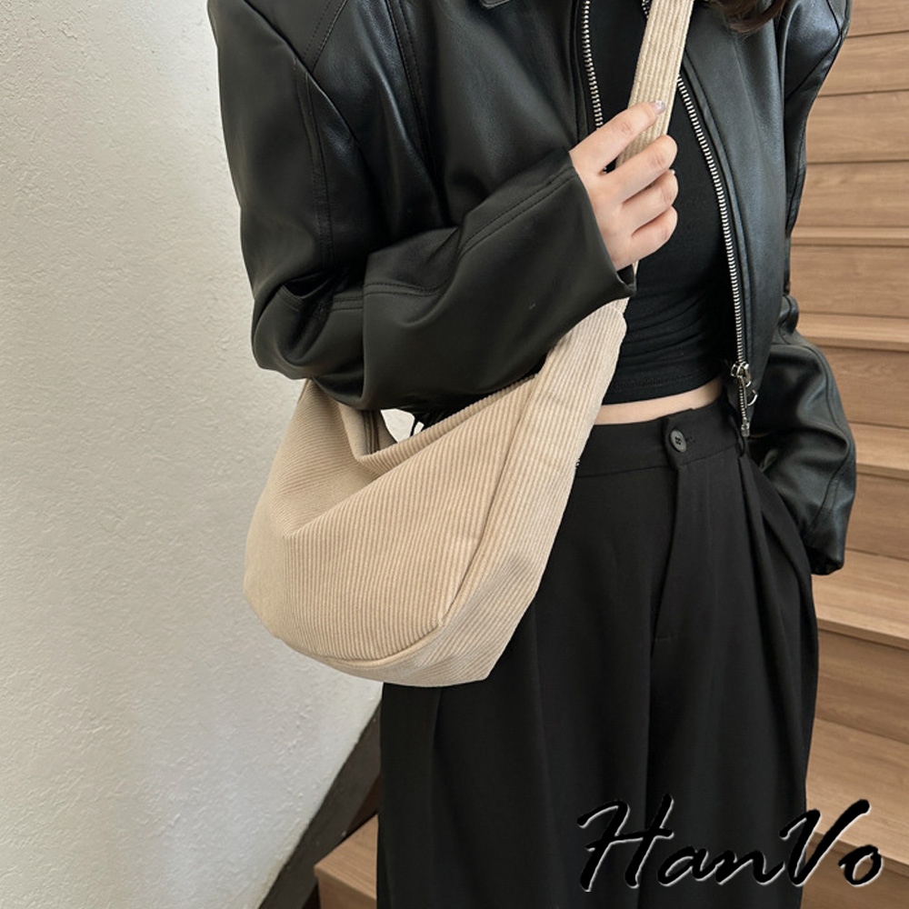 【HanVo】簡約大容量燈心絨餃子包 韓系單肩母子包 上課上班包 韓系帆布包 女生配件 C05-1084黑色|白色|卡其|深咖HanVo Wear Collection