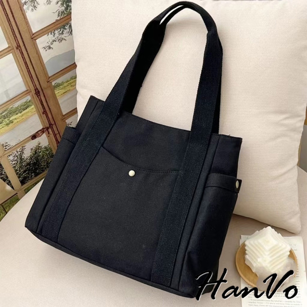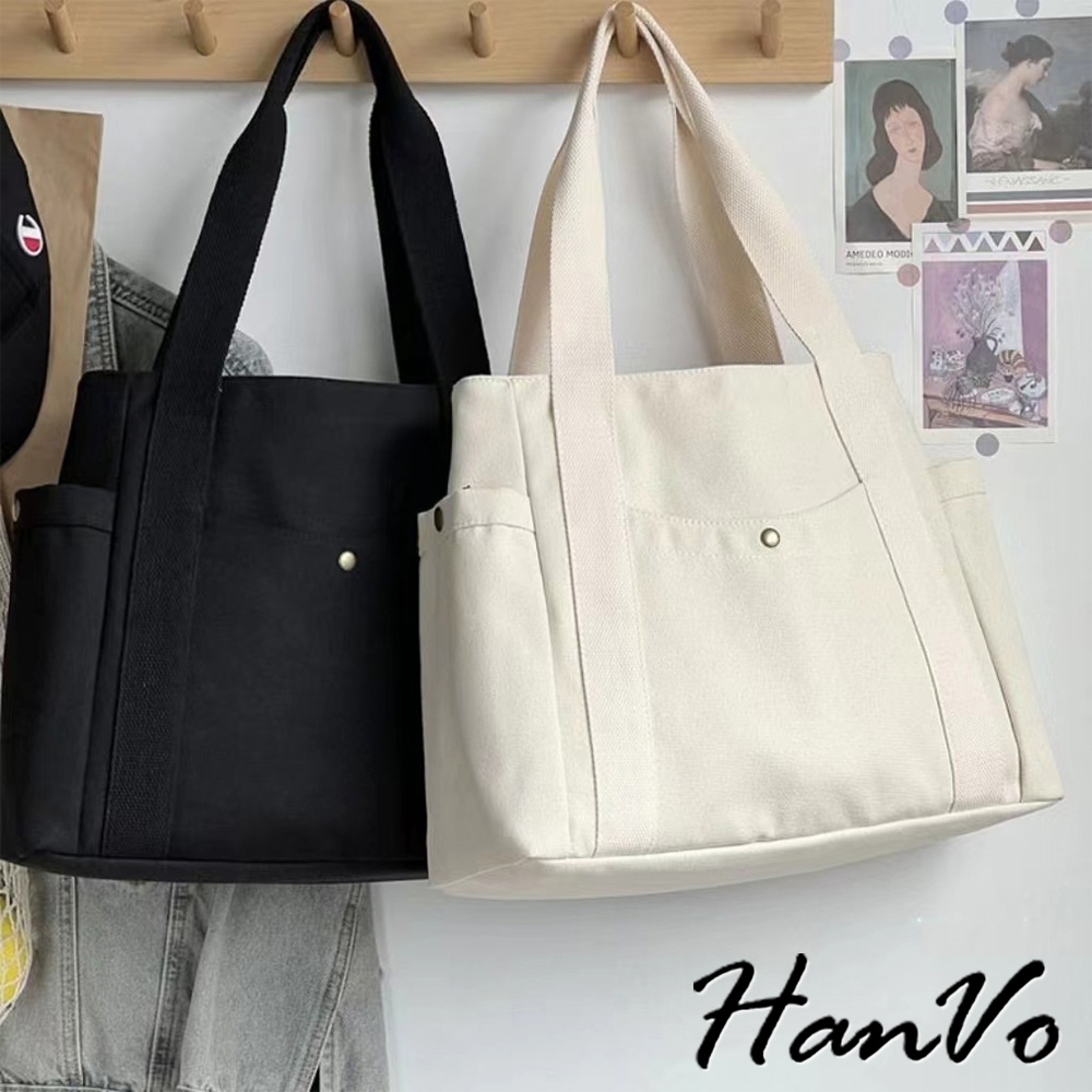 【HanVo】多口袋大容量實用帆布包 百搭簡約質感肩背包 上課上班包 韓系帆布包 女生配件 C05-1097米色|黑色HanVo Wear Collection