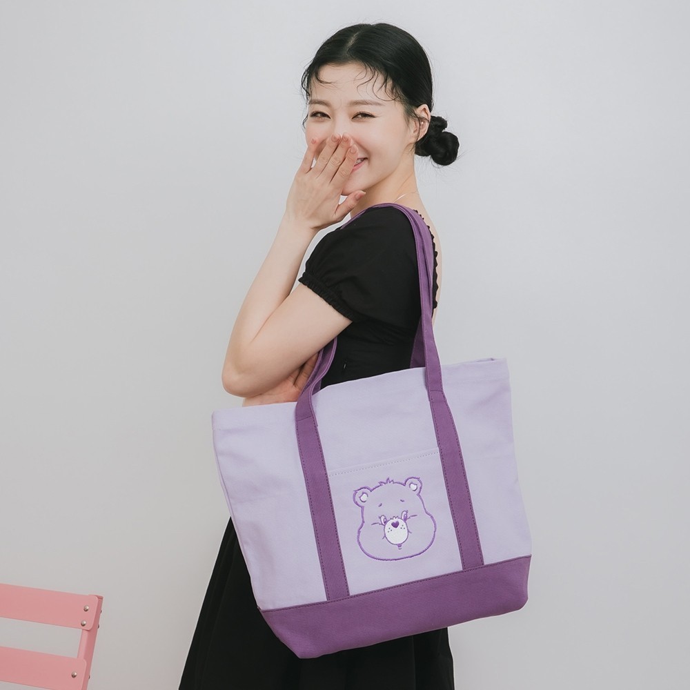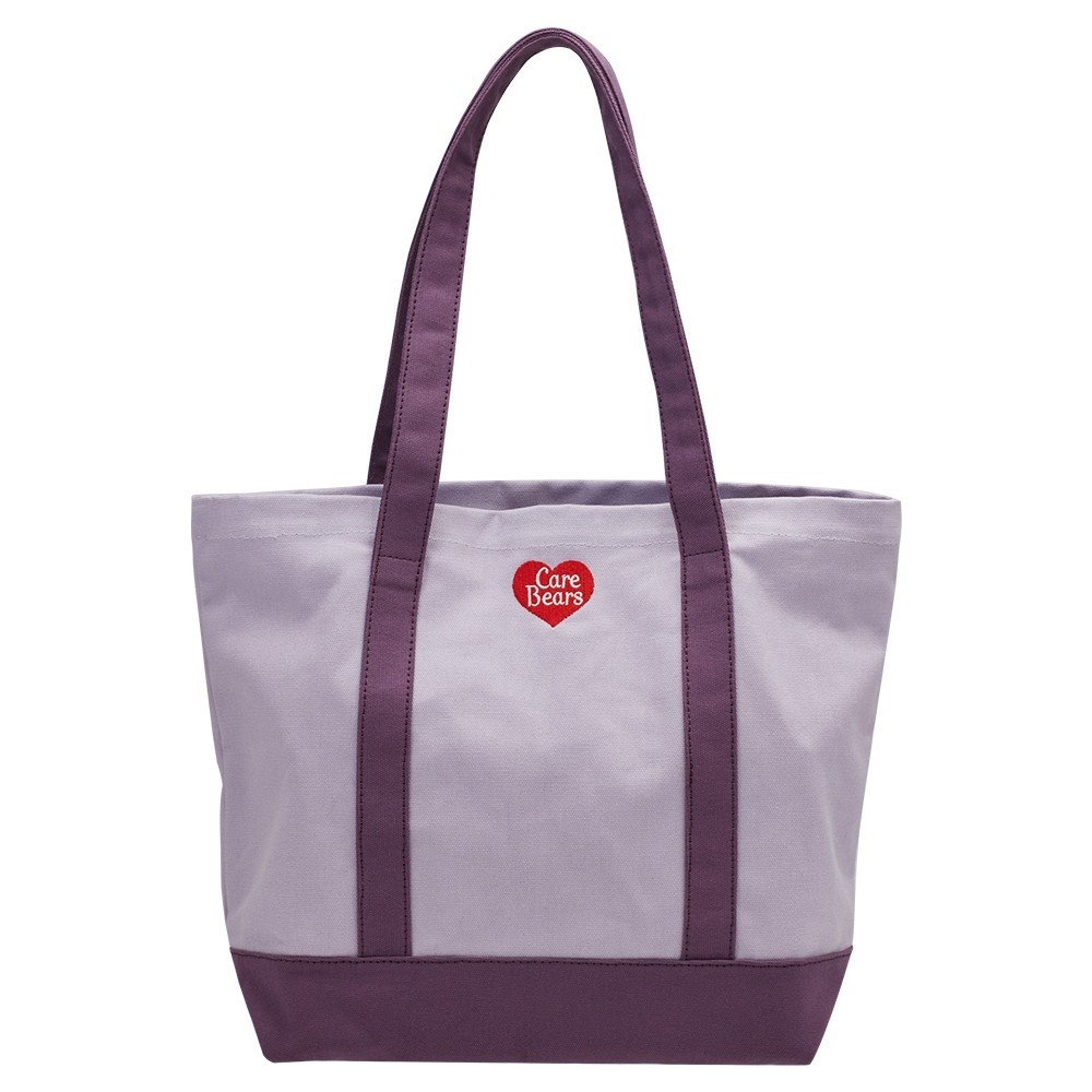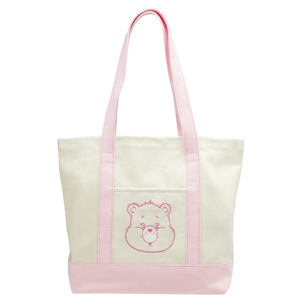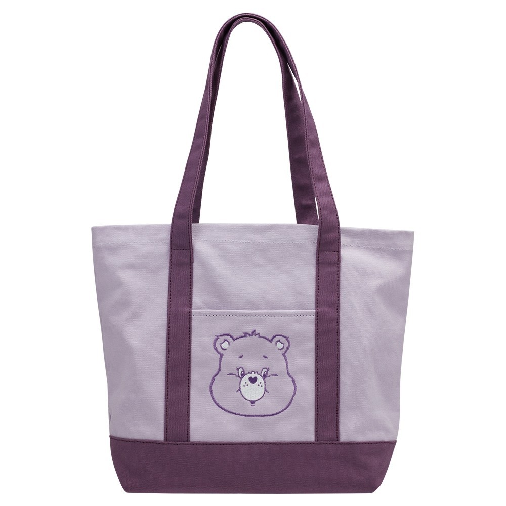 【Grace Gift】帆布袋【CareBears-溫柔小熊/鑽石/分享/樂觀撞色口袋肩背帆布旅行袋】4色 旅行袋粉紅|米白|淺駝|紫Grace gift 正式官方旗艦店