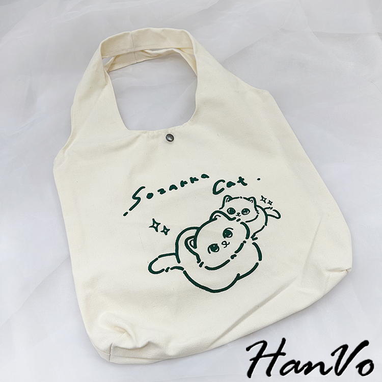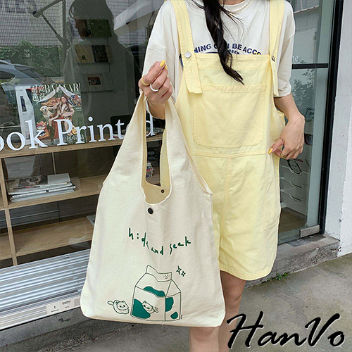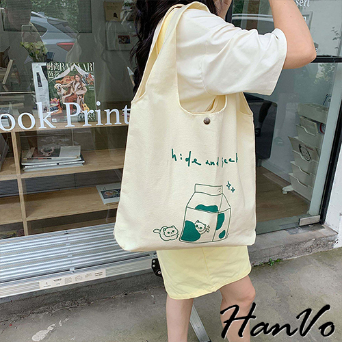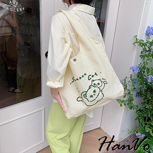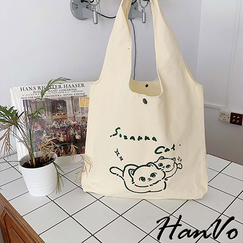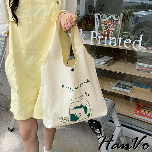 【HanVo】日系奶呼呼傻眼貓咪帆布包 韓國百搭實用大容量包包 上課上班包 韓系帆布包 女生配件 C05-1072恩愛貓|牛奶盒貓HanVo Wear Collection